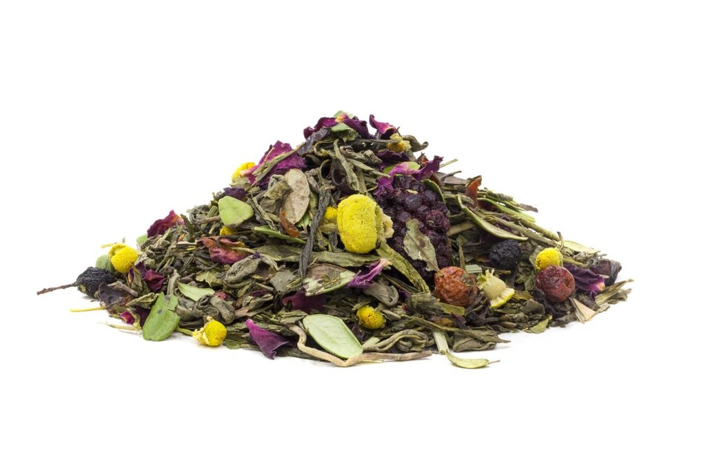 Зелёный чай с добавлением листьев брусники, грецкого ореха, лимонный травы, кожуры шиповника, ягод черноплодной рябины, красной смородины, ежевики и лепестков розы. Этот чай прекрасно подойдёт любител... Показать описаниеям здорового образа жизни. При заваривании чай даёт светло-зелёный настой со свежим вкусом и приятным ароматом трав и ягод. Данный чай тонизирует, повышает настроение и укрепляет здоровье. Состав: чай зелёный сенча-ганпаудер, ягоды аронии, шиповник, сублимированные ягоды красной смородины и ежевики, лист брусники и грецкого ореха, цветки ромашки, лепестки розы красной, лимонная трава, ароматизатор.
