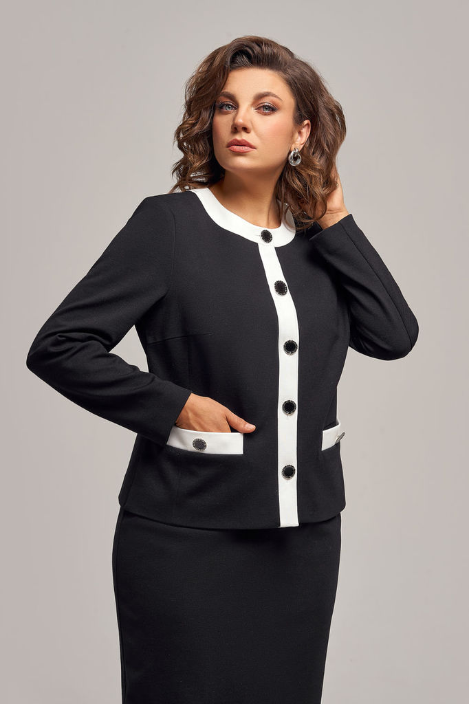 Состав: Костюм: Вискоза-70%; Спандекс-5%; Поливискоза-25%; Подкладка: ПЭ-100%; Женский костюм, состоящий из жакета и юбки. Жакет полуприлегающего силуэта из трикотажа  средней плотности, частично... Показать описание на подкладке с плечевыми накладками и втачными рукавами, по переду функциональные накладные карманы, застежка на петли и пуговицы. Декор по планке, горловине и листочке кармана из ткани белого цвета. Юбка полуприлегающего силуэта на эластичной подкладке с притачным поясом, в боковые швы которого вставлена резинка для лучшего прилегания, по спинке шлица, застежка на молнию, петлю и пуговицу. Костюм полностью соответсвует заявленному размеру. Пожалуйста, пользуйтесь таблицей обмеров готового изделия. Белая ткань устойчива к перекрашиванию благодаря современным технологиям.                                                                  Рекомендована химчистка.