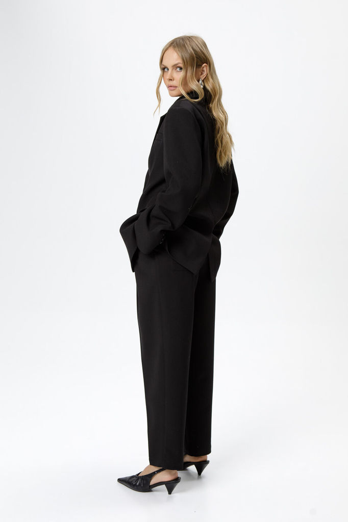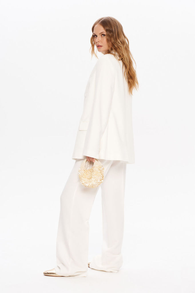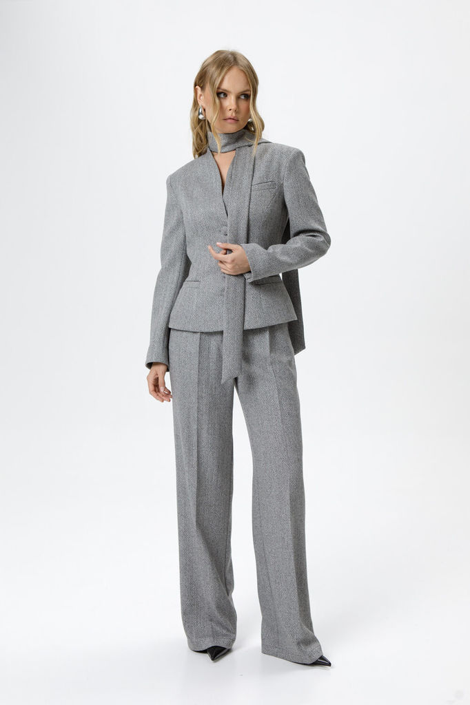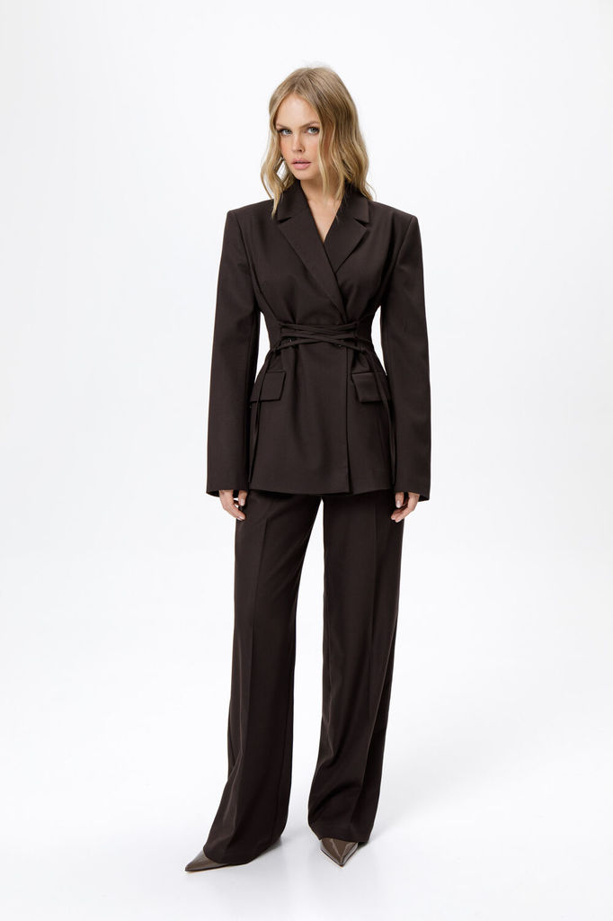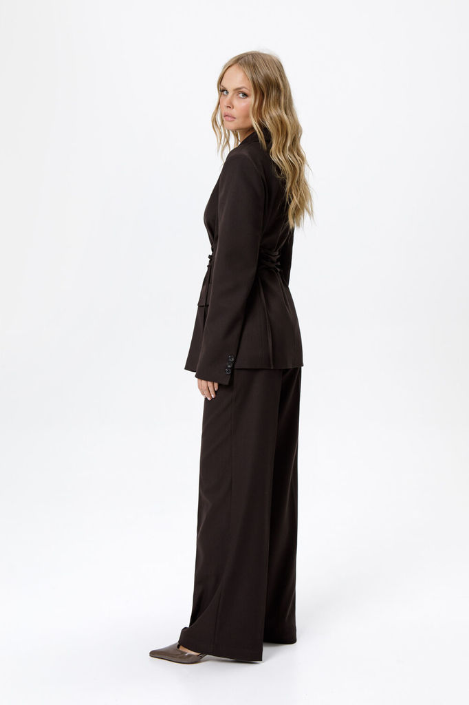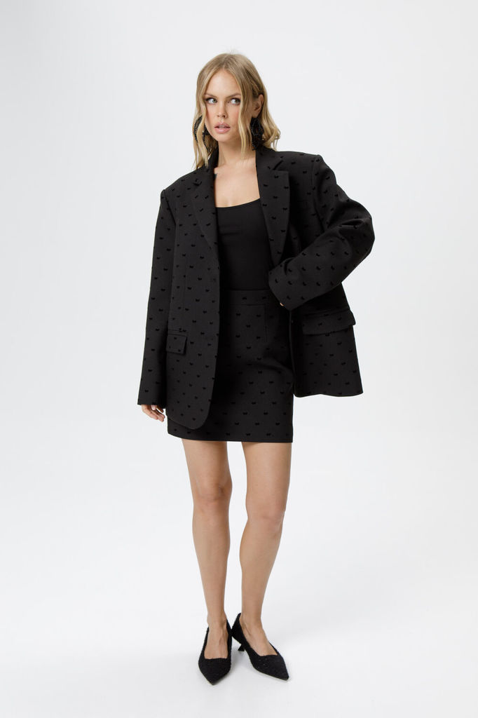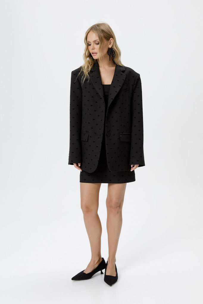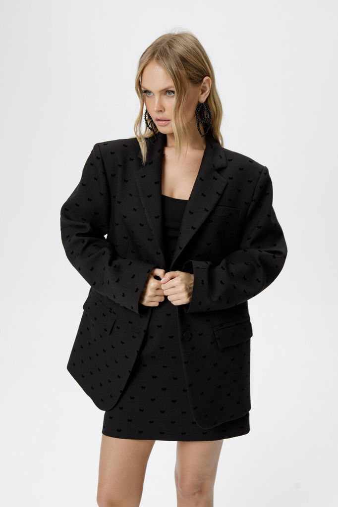 Состав: Жакет: Вискоза-33%; ПЭ-64%; Спандекс-3%; Подкладка: Вискоза-45%; ПЭ-55%; Оверсайз жакет из костюмной ткани с бантиками из флока.