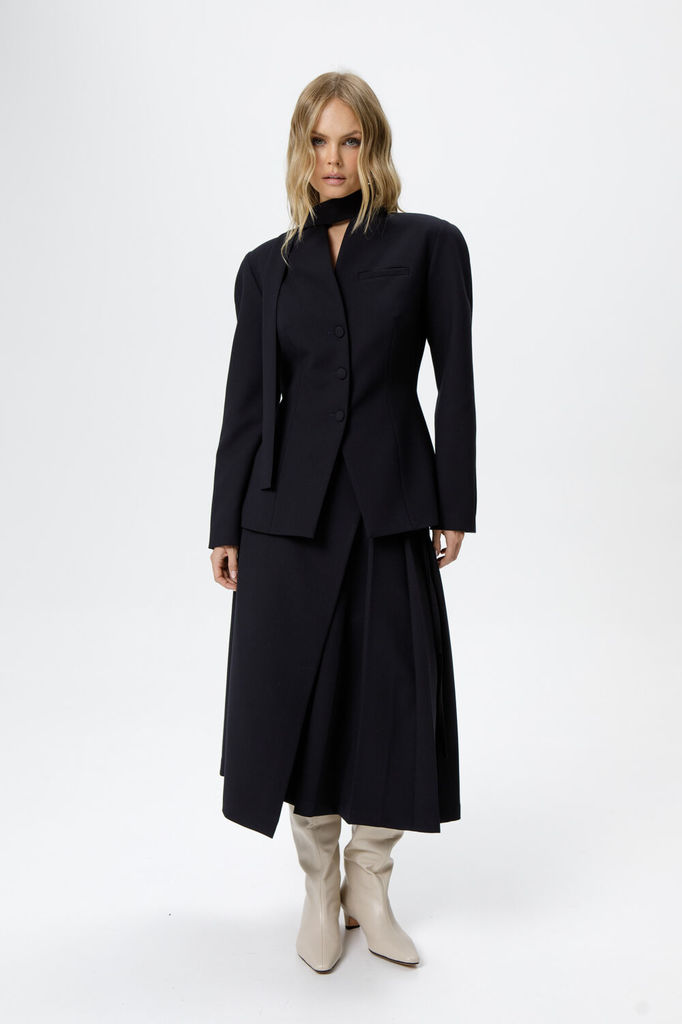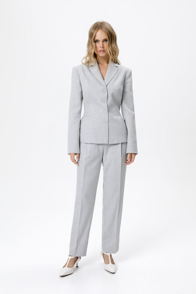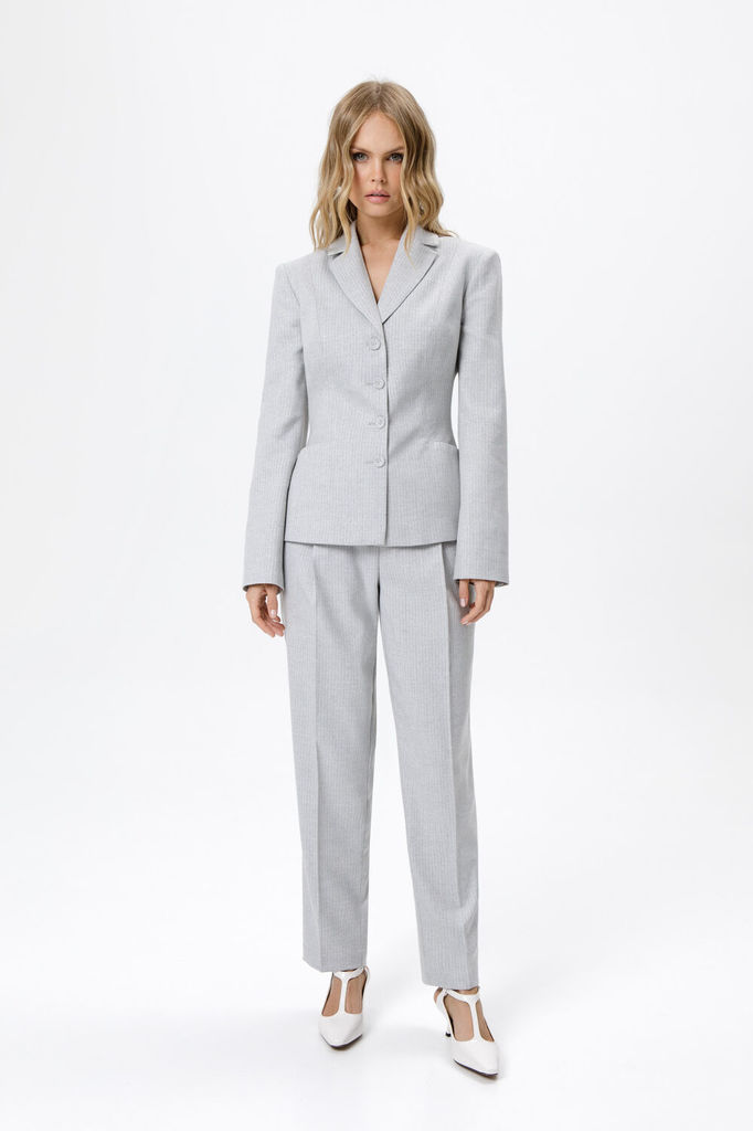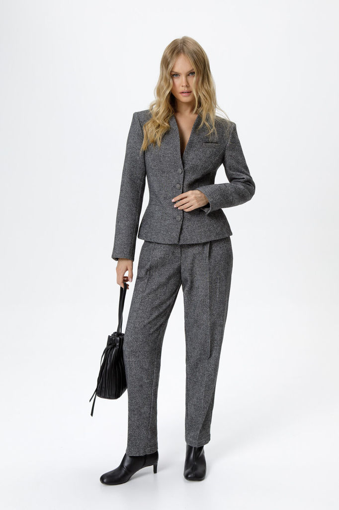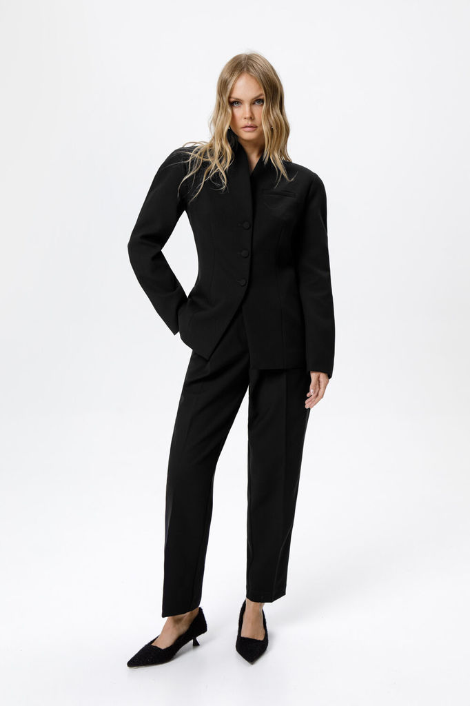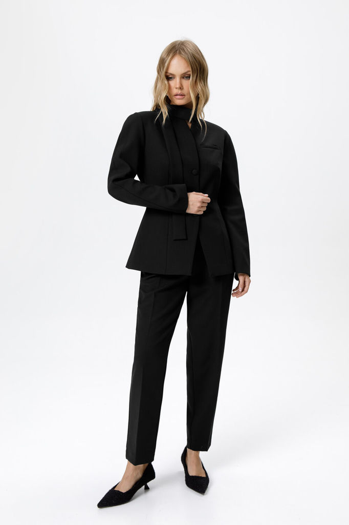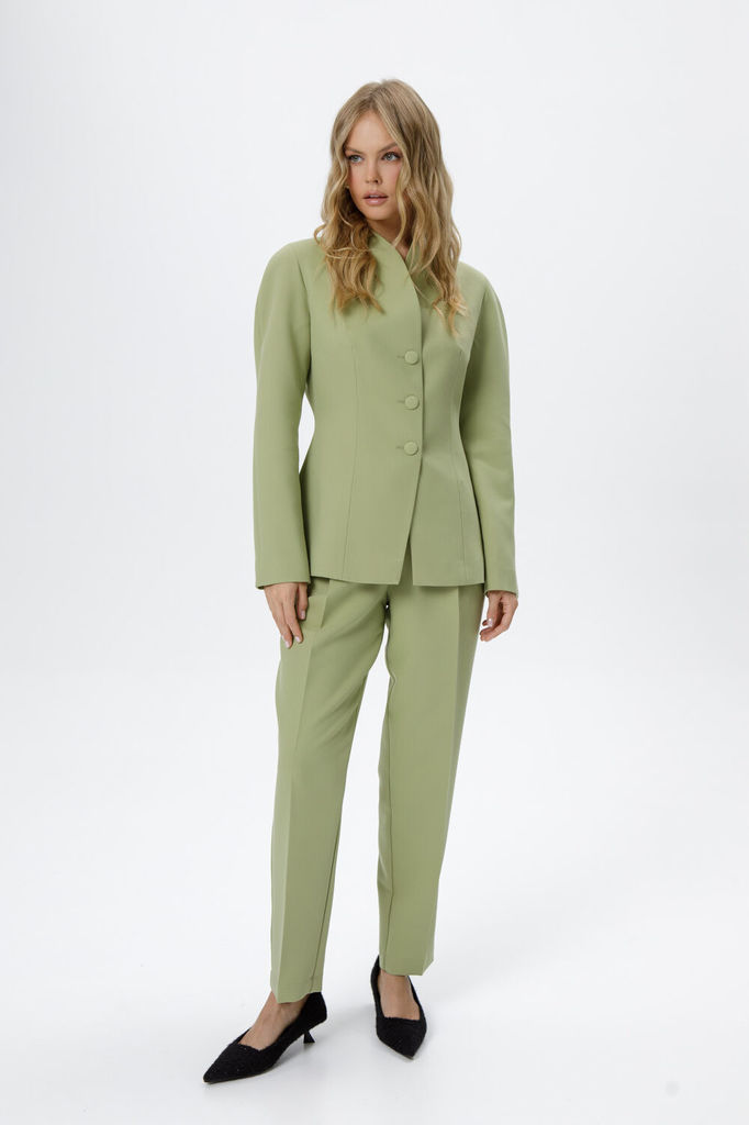 Состав: Костюм: Вискоза-20%; ПЭ-76%; Спандекс-4%; Подкладка: Вискоза-55%; ПЭ-45%; Приталенный жакет с акцентными плечами и воротником-стойкой.
