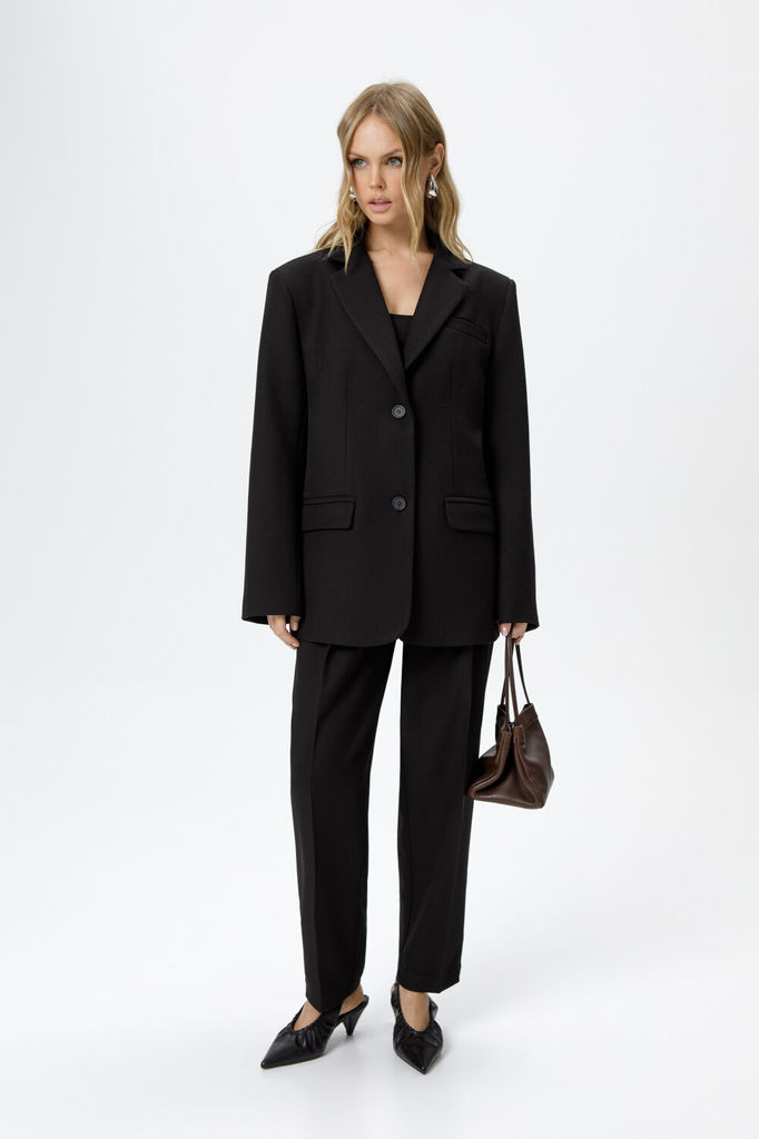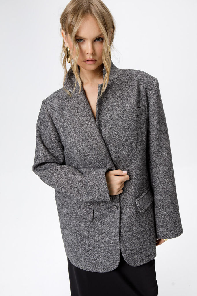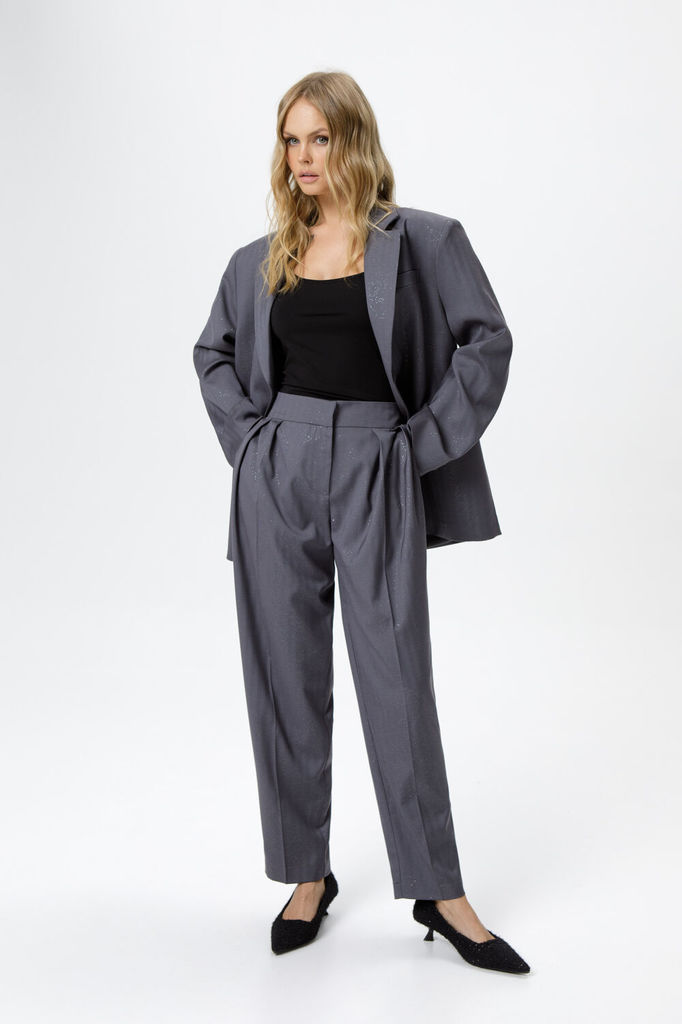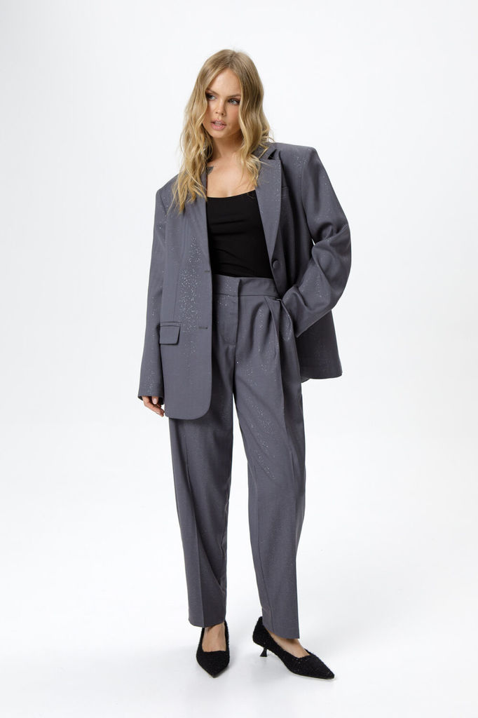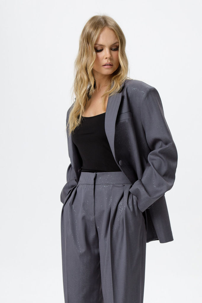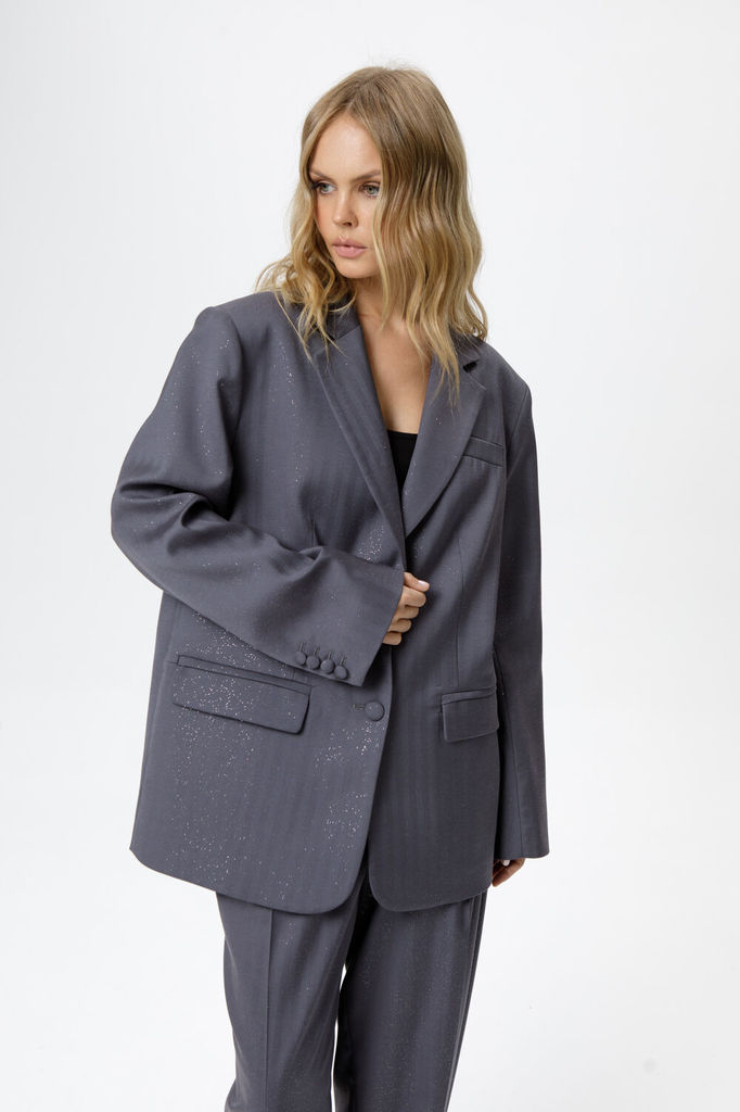 Состав: Жакет: Вискоза-22%; ПЭ-73%; Спандекс-5%; Подкладка: Вискоза-55%; ПЭ-45%; Оверсайз жакет из костюмной ткани с блестками.