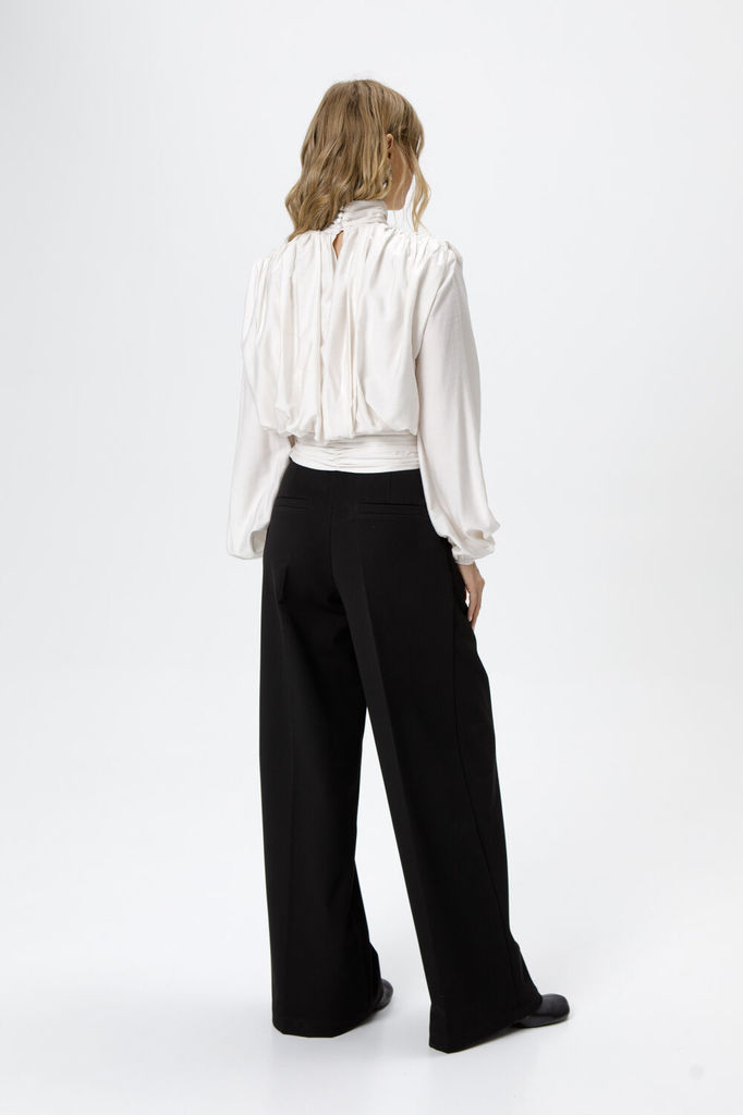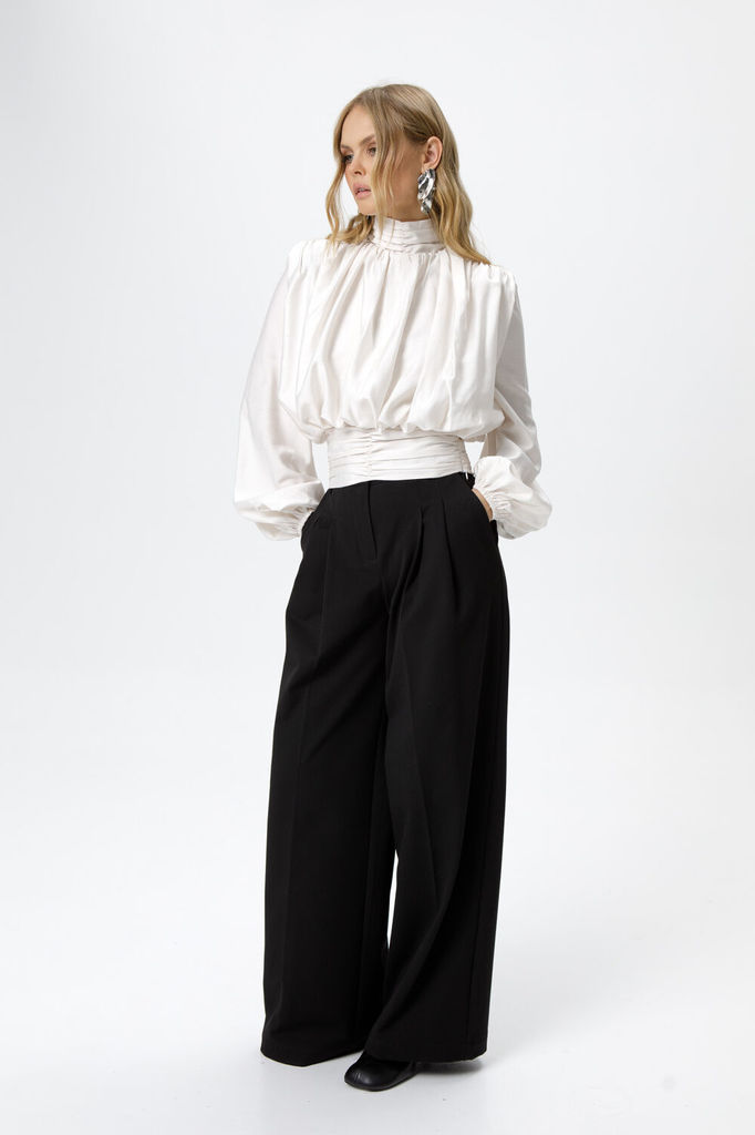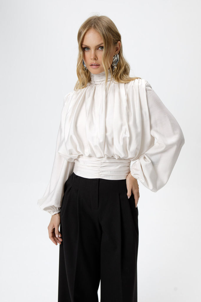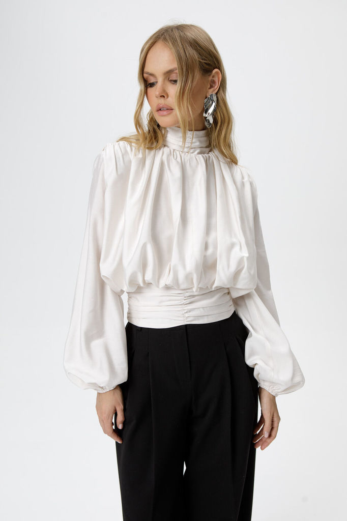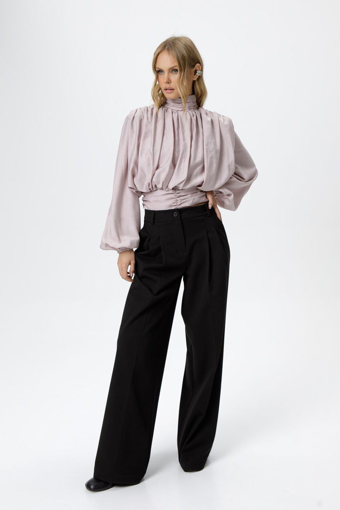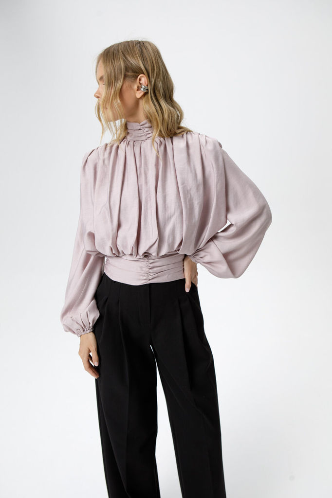 Состав: Вискоза-80%; ПЭ-10%; Шерсть-10%; Укороченная блуза из вискозного текстиля. Детали: блуза приталенного силуэта, перед и спинка свободного покроя, пояс блузы со сборкой, расширенные плечи, сборк... Показать описаниеи по плечам и горловине, застёжка на потайную молнию в боковом шве, воротник стойка со сборкой и застёжкой на навесные петли и пуговицы, втачные расширенные к низу рукава с резинкой по низу. Длина изделия по спинке около 48 см, длина рукава около 65 см.