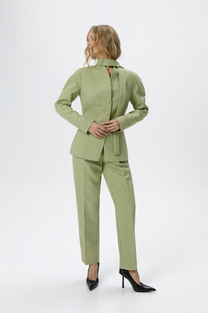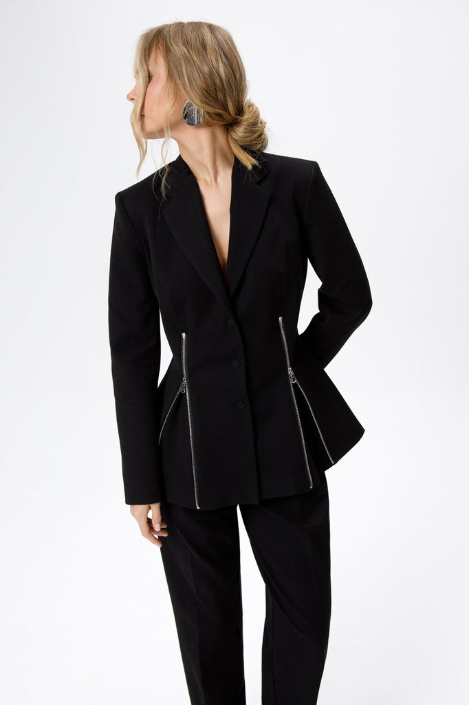 Состав: Жакет: Вискоза-33%; ПЭ-64%; Спандекс-3%; Подкладка: Вискоза-55%; ПЭ-45%; Приталенный жакет с молниями.