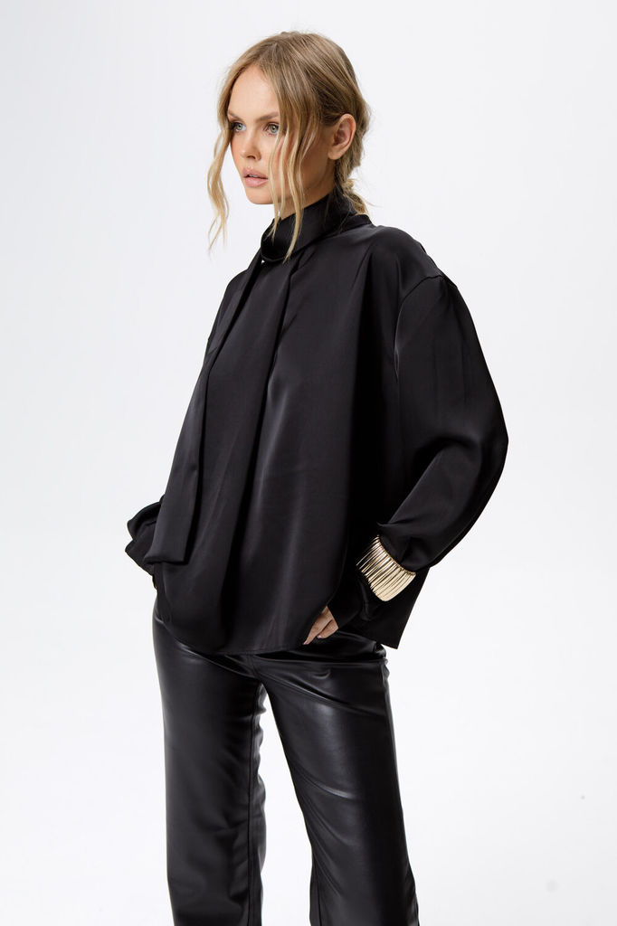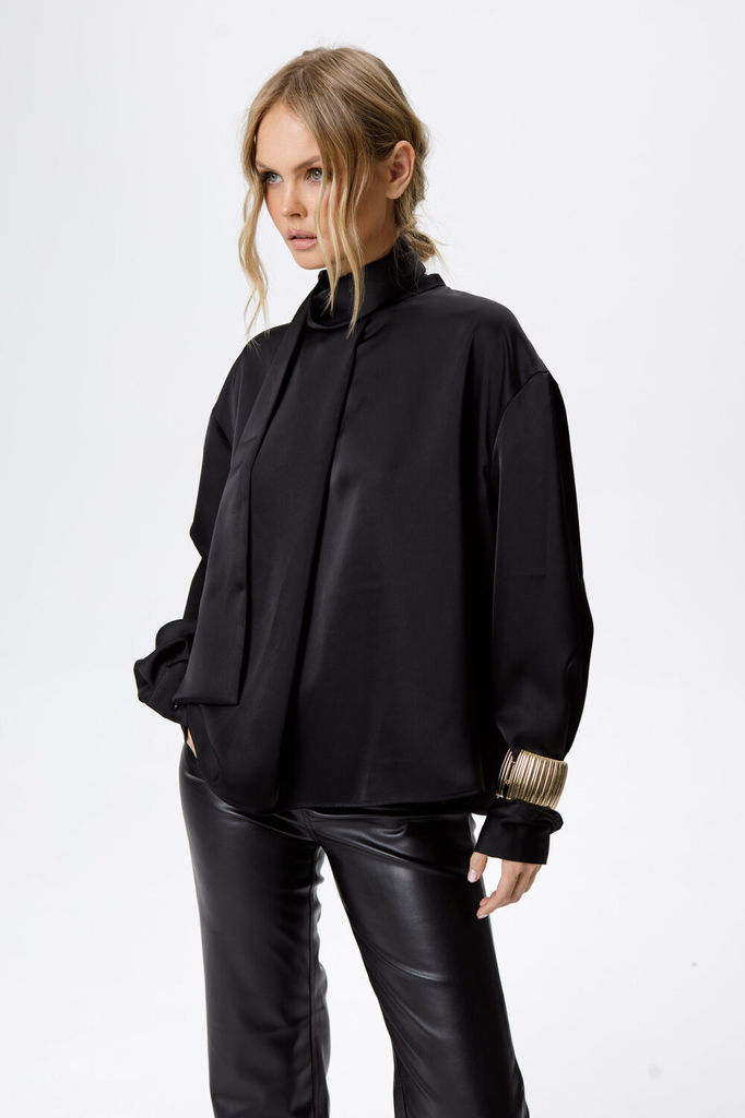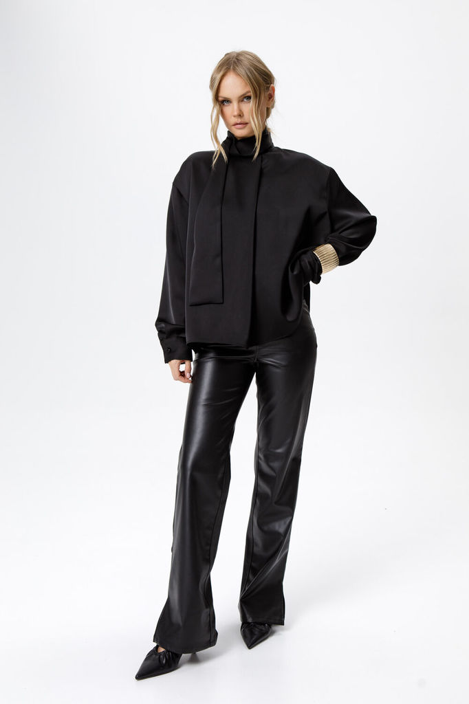 Состав: Вискоза-48%; ПЭ-52%; Струящаяся свободная блуза со стойкой-бантом. Детали: прямой силуэт, высокий воротник стойка с широкими длинными завязками, блуза с глубокой складкой по переду, удлинённая... Показать описание линия плеча, рукава с притачными манжетами и застёжкой на пуговицу. Длина изделия по спинке около 61 см, длина рукава около 60 см
