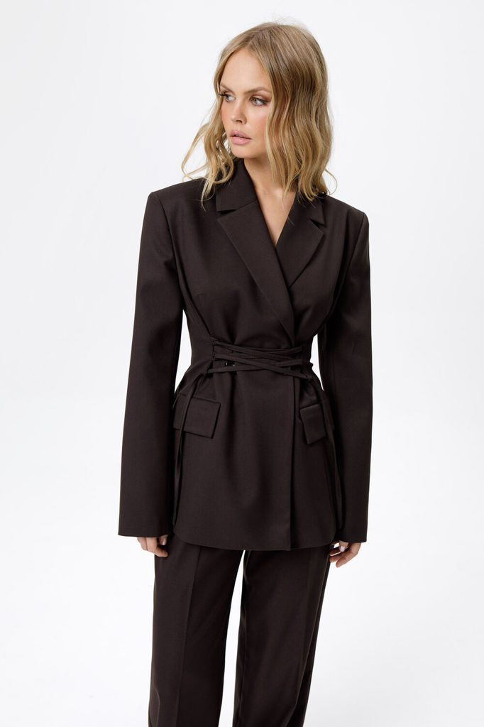 Состав: Жакет: Вискоза-29%; ПЭ-69%; Спандекс-2%; Подкладка: Вискоза-55%; ПЭ-45%; Жакет со шнуровкой. Детали: жакет полуприлегающего силуэта, расширенные плечи, рельефы, пиджачный воротник, застежка на... Показать описание две петли и пуговицы, функциональные карманы, жакет на подкладке. Жакет также можно зашнуровать по бокам. Длина по спинке около 69 в размерах 40-46 и около 72 см в размерах 48-52, длина рукавов около 61 см