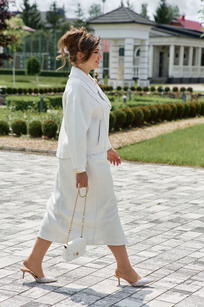 Состав: Костюм: ПЭ-35%; Хлопок-17%; Акрил-48%; Подкладка: ПЭ-100%; Модель отшивается под заказ. Срок пошива от 3 недель. Изящный женский костюм из твида в стиле Шанель, состоящий из жакета и юбки. Жак... Показать описаниеет «оверсайз» свободного силуэта, выполненный в стиле «косуха». Жакет с ассиметричным бортом и застёжкой на тесьму молнию. Воротник отложной, пиджачного типа с декоративной отделкой в виде бахромы из основной ткани. По переду жакета рельефы со вставкой бахромы из основной ткани, декоративными карманами» рамку» с застёжкой на тесьму молнию. Линия плеча спущенная, рукав втачной, длинный. Спинка без особенностей. Низ в жакете ассиметричный. Жакет на подкладке. Юбка А- силуэта длины миди с высоким разрезом в среднем шве переда юбки. Пояс притачной с эластичной тесьмой в бочках от талиевых вытачек, что обеспечивает максимально комфортную посадку на любой тип фигуры. Застёжка на тесьму молнию в среднем шве спинки юбки и пуговицу в поясе. Юбка на подкладке. Жакет 50 52 54 56 58 60 обхват груди 113 117 121 125 129 133 ширина изделия внизу 117 121 125 129 133 137 ширина рукава вверху 45 47 49 51 53 55 Юбка 50 52 54 56 58 60 длина по боковому шву без резинки 86 86 86 86 86 86 ширина по талии в растянутом виде 92 96 100 104 108 112 ширина на уровне линии бедер 116 120 124 128 132 136
