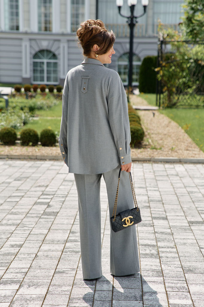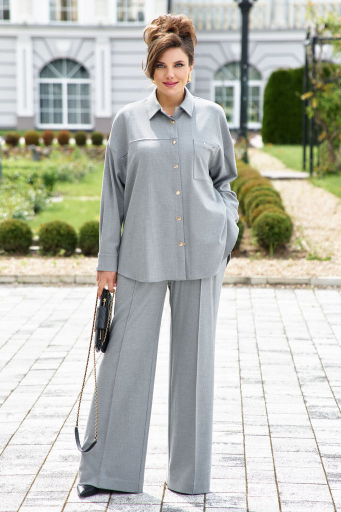 Состав: Вискоза-33%; ПЭ-63%; Эластан-4%; Модель отшивается под заказ. Срок пошива от 3 недель. Костюм женский, состоящий из рубашки и брюк. Рубашка «оверсайз» свободно ниспадает с плеч, её мягкие форм... Показать описаниеы подчёркивают лёгкую небрежность, но не лишены чёткости линий. По переду центральная застёжка на декоративные кнопки по планке, воротник рубашечного типа. По правой детали переда отрезная кокетка, по левой накладной карман с отделочным декоративным элементом в виде хольнитен от верха кармана. Спинка с декоративным элементом в виде притачной вставки переходящей в отлетной хлястик с отделочной шлёвкой. В качестве дополнительной отделки декоративные кнопки и хольнитены и кнопки по хлястику. Линия плеча в рубашке спущенная. Рукав втачной, длинный с заложенной складкой по низу и притачной манжетой с застёжкой на декоративные функциональные кнопки. Низ в рубашке фигурной формы. В боковых швах от низа разрезы. Прямые брюки с застроченными стрелками выстроены по фигуре. По переду застежка на тесьму молнию в гульфике и пуговицу в поясе. По переду брюк наклонные карманы. Пояс притачной со вставкой эластичной тесьмы резинки в «бочках», что обеспечивает комфортную посадку на фигуру. Блузка 52 54 56 58 60 62 обхват груди 126 130 134 138 142 146 обхват бедер (низ) 132 136 140 144 148 152 ширина рукава вверху 42 44 46 48 50 52 Брюки 52 54 56 58 60 62 длина по боковому шву без резинки 108 108 108 108 108 108 ширина по талии в растянутом виде 98 102 106 110 114 118 ширина на уровне среднего шва 114 118 120 124 128 132
