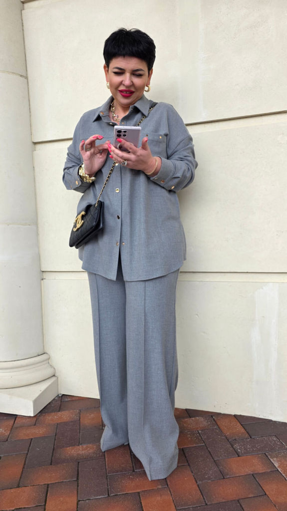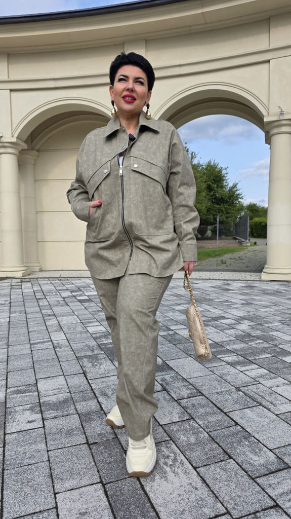 Состав: Жакет: ПЭ-20%; Лиоцелл-80%; Подкладка: ПЭ-100%; Брюки: ПЭ-60%; ПУ-40%; Модель отшивается под заказ. Срок пошива от 3 недель. Основа этого ансамбля — брюки из высококачественной кожи глубокого ... Показать описаниесерого оттенка. Жакет выполнен в тон брюкам, но имеет едва заметный абстрактный узор, добавляющий ему уникальности. Двубортный крой жакета с акцентными пуговицами придает образу структурность и шик. Жакет свободного прямого силуэта с отрезным бочком, а также отложным лацканом и пиджачным воротником, двубортный на четыре декоративные пуговицы и петли. По переду с талевыми вытачками и прорезными карманами в рамку. Спинка жакета со средним швом, жакет на подкладке. Рукав пиджачный, двухшовный. Брюки слегка зауженные к низу с рельефами по переду вверху карманы. По задней части брюк талевые вытачки. Пояс притачной по боковым частям с резинкой для максимального комфорта на любой фигуры. Жакет 50 52 54 56 58 60 обхват груди 112 116 120 124 128 132 ширина рукава вверху 39 41 43 43 45 47 ширина изделия внизу 120 124 128 132 136 140 Брюки 50 52 54 56 58 60 длина по боковому шву без резинки 98 98 98 98 98 98 ширина по талии в растянутом виде 96 100 104 108 112 116 ширина на уровне среднего шва 112 116 120 124 128 132