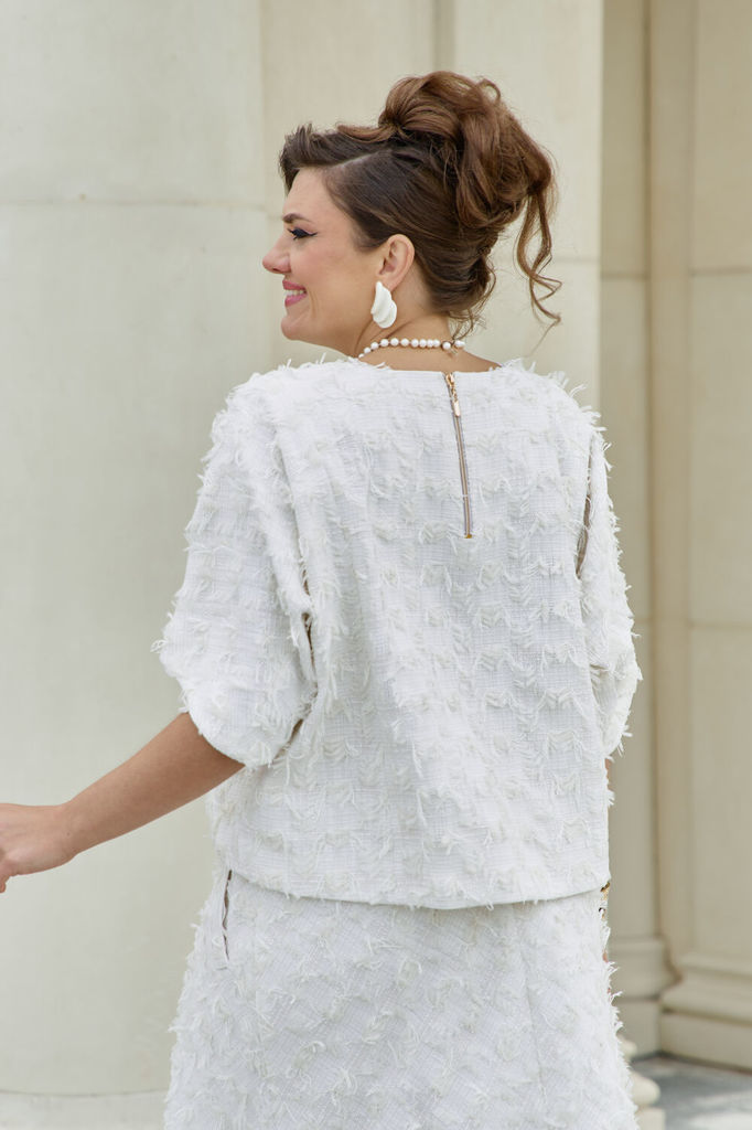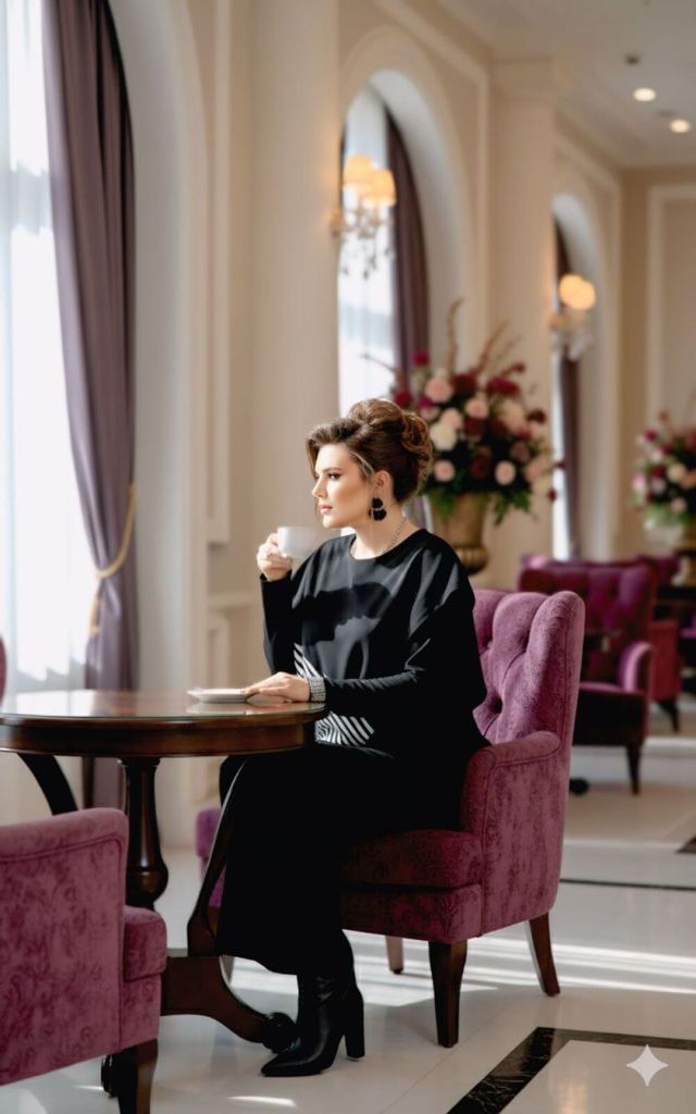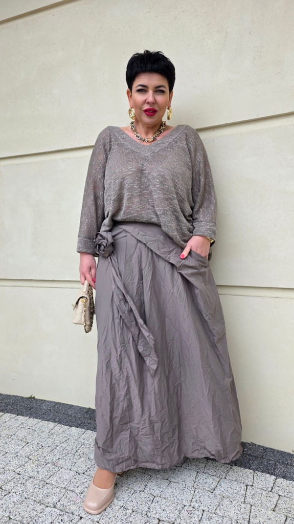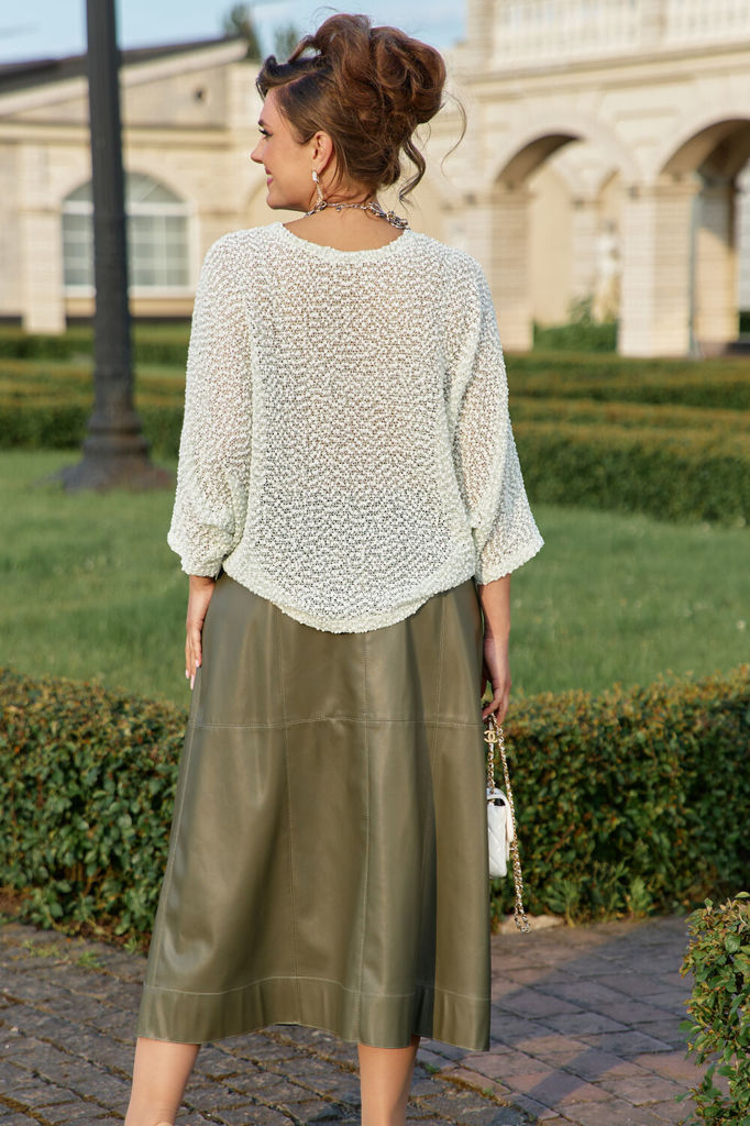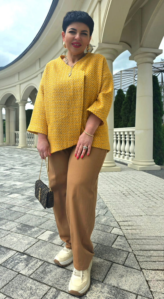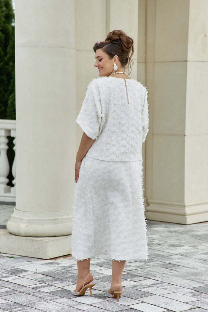 Состав: Блуза: Вискоза-67%; Спандекс-3%; Нейлон-30%; Юбка: ПЭ-27%; Хлопок-71%; Эластан-2%; Модель отшивается под заказ. Срок пошива от 3 недель. Комплект женский, состоящий из блузона и юбки. Оверсайз... Показать описаниеный блузон. V-образный вырез мягко обрамляет шею. Тонкая вязка, чуть растягиваясь на движениях, создаёт ощущение второго слоя кожи — тёплой, невесомой, бесконечно нежной. Рукав в блузоне цельнокроеный с притачной манжетой по низу. Юбка трапециевидного силуэтат. Объёмная, но не тяжеловесная, она играет с пропорциями, мягко округляясь на бёдрах и изящно расширяясь к низу. Ткань со сжатым эффектом добавляет динамики: то собирается в лёгкие складки, то разглаживается, будто дышит в такт шагам. Пояс в юбке притачной со вставкой декоративной тесьмы-резинки в бочках. По переднему полотнищу юбки от бокового шва закладывается декоративная складка с функциональным карманом. По заднему полотнищу брюк застёжка на потайную тесьму-молнию в среднем шве и пуговицу в поясе. В комплекте идёт декоративное украшение в виде съёмной броши-цветка из основной ткани. Блузка 50 52 54 56 58 60 обхват груди 136 136 136 144 144 144 ширина изделия внизу 136 136 136 144 144 144 ширина рукава внизу 40 40 40 42 42 42 Юбка 50 52 54 56 58 60 длина по среднему срезу без пояса 88 88 88 88 88 88 ширина по талии в растянутом виде 96 100 104 108 112 116 ширина на уровне линии бедер 136 136 136 148 148 148