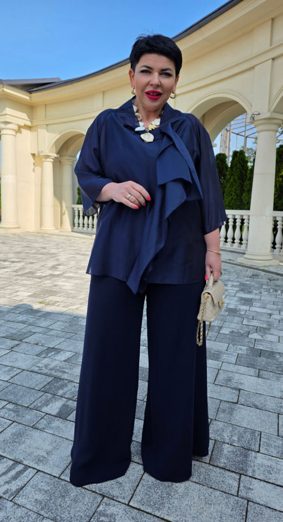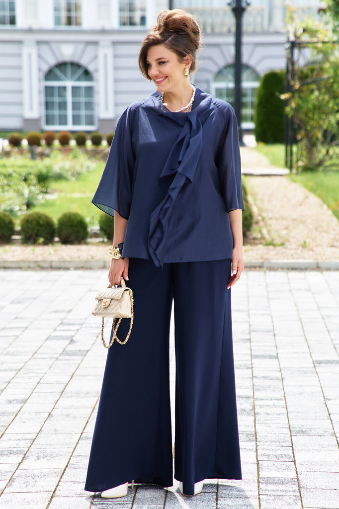 Состав: Блуза: ПЭ-15%; Лиоцелл-85%; Брюки: ПЭ-100%; Модель отшивается под заказ. Срок пошива от 3 недель. Элегантный брючный костюм, выполненный в мерцающем синем оттенке, который идеально подхо... Показать описаниедит для создания утонченных образов. Комплект состоит из свободной блузы широких брюк палаццо, обеспечивая непревзойденный комфорт и легкость движений. Блузка привлекает внимание своим асимметричным дизайном с драпировками и широким, ниспадающим воротником, который придает образу динамичность и изысканность. Блуза свободного силуэта, с двойными деталями переда и спинки. Головина округлой формы. Рукав в блузе реглан, длиной ?, что добавляет силуэту легкости и воздушности. В боковых швах блузы разрезы. Брюки с высокой посадкой и струящимся кроем визуально удлиняют ноги, создавая безупречный и гармоничный ансамбль. Этот костюм идеально подходит как для торжественных мероприятий, так и для деловых встреч, подчеркивая ваш безупречный вкус и чувство стиля. Длина блузы по спинке 68 см. Длина рукава блузы 48 см (р 50-54), 49 см (р 56-60). Длина брюк по боковому шву 108см (р 50-56), 108,5 см (р 58-60). Блуза 50 52 54 56 58 60 обхвт груди 120 124 128 132 136 140 обхват бедер 128 132 136 140 144 148 длина рукава 48 48 48 49 49 49 длина по спинке 68 68 68 68 68 68 Брюки 50 52 54 56 58 60 длина по боковому шву 108 108 108 108 108,5 108,5 ширина уровне среднего шва 120 124 128 132 136 140 ширина по линии талии 76/110 80/114 84/118 88/122 92/126 96/130