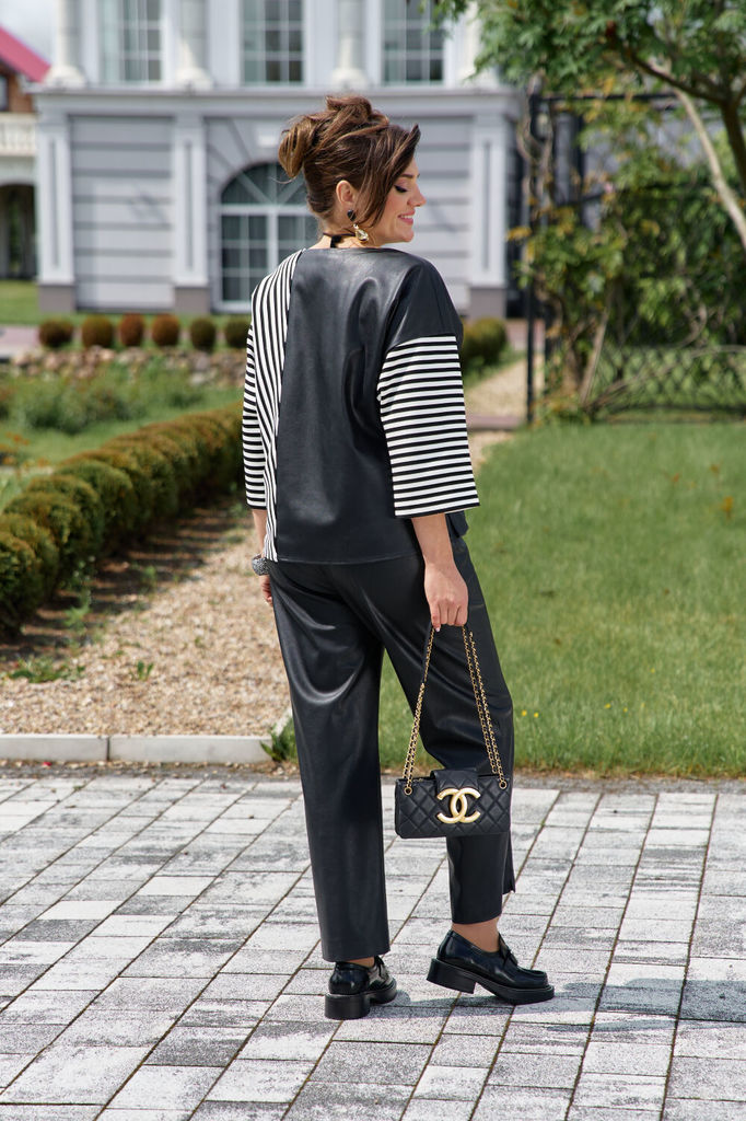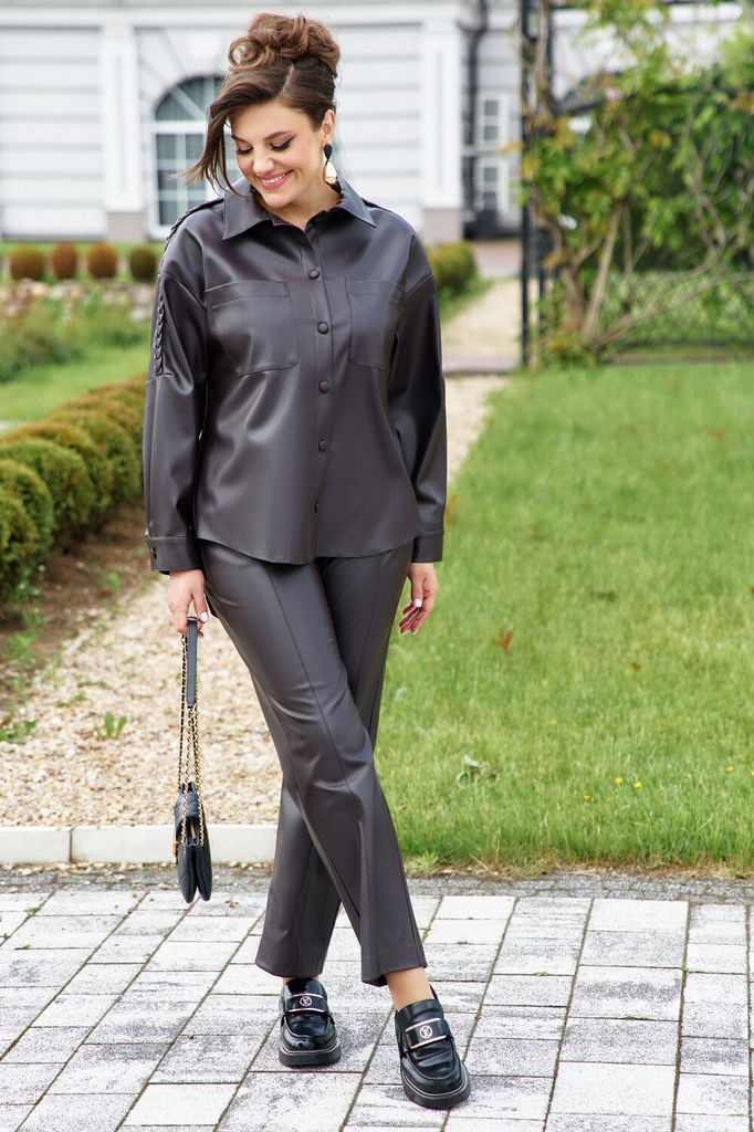Состав: Блуза: ПЭ-60%; ПУ-40%; Брюки: ПЭ-60%; ПУ-40%; Модель отшивается под заказ. Срок пошива от 3 недель. Комплект женский, состоящий из блузона и брюк. Блузон (состав: 60% полиэстер, 40% полиуретан... Показать описание) свободного силуэта, с вырезом горловины по форме «лодочка». По переду и спинке блузона вертикальный подрез смещённый влево от центра со вставкой из отделочного материала. Рукава в блузоне разных видов- левый цельнокроеный, длиной 7/8; по правой стороне линия плеча спущенная, рукав втачной, из отделочной ткани, длиной 7/8. Низ ассиметричный, в боковых швах от низа небольшие разрезы. Брюки (состав: 60% полиэстер, 40% полиуретан). прямого силуэта из кожи с рельефами и отстрочкой по переду. По переду застежка на тесьму молнию в гульфике и пуговицу в поясе. По переду брюк наклонные карманы. Пояс притачной со вставкой эластичной тесьмы резинки в «бочках», что обеспечивает комфортную посадку на фигуру. Мягкая, но плотная кожа облегает фигуру, не стягивая её, а лишь подчёркивая женственные изгибы, добавляют образу элегантной строгости. В качестве дополнительного декоративного элемента в комплекте идёт декоративное украшение. Обращаем Ваше внимание, что фурнитура может незначительно отличаться от фото. Длина блузы 65 см (р 52-56), 67 см (р 58-62). Длина рукава 56 см. Длина брюк по боковому шву 98 см. Блуза 52 54 56 58 60 62 обхват груди 124 124 124 128 128 128 ширина изделия внизу 122 122 122 130 130 130 ширина рукава вверху 54 54 54 54 54 54 длина по спинке 65 65 65 67 67 67 Брюки 52 54 56 58 60 62 длина по боковому шву без резинки 98 98 98 98 98 98 ширина по талии в растянутом виде 100 104 108 112 116 120 ширина на уровне среднего шва 116 120 124 128 132 136