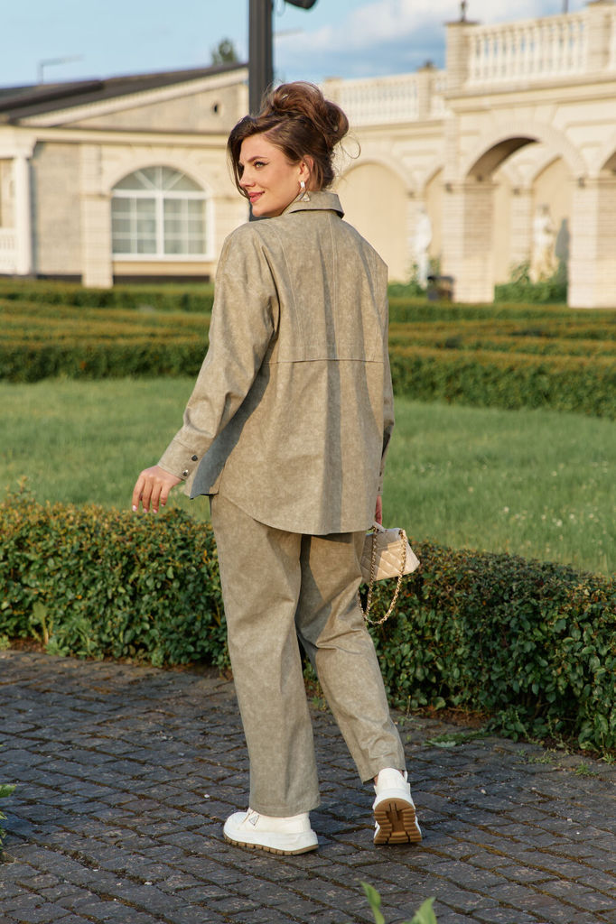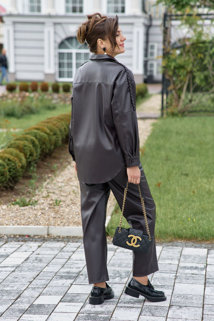 Состав: ПЭ-60%; ПУ-40%; Модель отшивается под заказ. Срок пошива от 3 недель. Костюм женский, состоящий из рубашки и брюк. Рубашка— не просто верх, а главный акцент. Кожа, плотная, но податливая, обра... Показать описаниезует «оверсайз» силуэт. Плечо, от места втачивания воротника и до вытачки по рукаву, украшены декоративными косичками из кожаных тесёмок. По переду рубашки застёжка на декоративные пуговицы в тон ткани по планке, и накладные карманы. Воротник рубашечного типа. Линия плеча спущенная. Спинка в рубашке с отрезной кокеткой. Рукав втачной, длинный с локтевым швом и разрезом от низа; заложенной складкой от низа и притачной манжетой. Низ в рубашке ассиметричный. Брюки прямого силуэта из кожи с рельефами и отстрочкой по переду. По переду застежка на тесьму молнию в гульфике и пуговицу в поясе. По переду брюк наклонные карманы. Пояс притачной со вставкой эластичной тесьмы резинки в «бочках», что обеспечивает комфортную посадку на фигуру. Длина рубашки по спинке 81 см. Длина рукава рубашки 52 см. Длина брюк по боковому шву 98 см. Рубашка 52 54 56 58 60 62 обхват груди 120 124 128 132 136 140 обхват талии 116 120 124 128 132 136 ширина изделия внизу 126 130 134 138 142 146 длина по спинке 81 81 81 81 81 81 Брюки 52 54 56 58 60 62 длина по боковому шву без резинки 98 98 98 98 98 98 ширина по талии в растянутом виде 100 104 108 112 116 120 ширина на уровне среднего шва 116 120 124 128 132 136