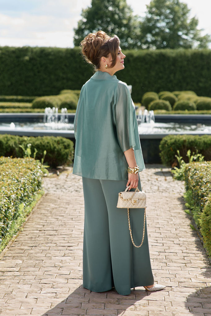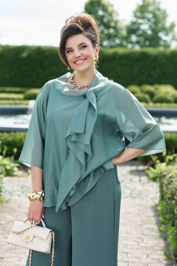 Состав: Блуза: ПЭ-15%; Лиоцелл-85%; Брюки: ПЭ-100%; Модель отшивается под заказ. Срок пошива от 3 недель. Брючный костюм, выполненный в мерцающем зелёном оттенка. Блузка привлекает внимание своим асим... Показать описаниеметричным дизайном с драпировками и широким, ниспадающим воротником, который придает образу динамичность и изысканность. Блуза свободного силуэта, с двойными деталями переда и спинки. Головина округлой формы. Рукав в блузе реглан, длиной ?, что добавляет силуэту легкости и воздушности, подчеркивая утонченность образа. В боковых швах блузы разрезы. Брюки с высокой посадкой и струящимся кроем визуально удлиняют ноги, создавая безупречный и гармоничный ансамбль. Пояс в брюках притачной с эластичной тесьмой-резинкой, что обеспечивает максимально удобную посадку на любой тип фигуры. В боковых швах брюк карманы. Нижняя блуза 50 52 54 56 58 60 обхвт груди 120 124 128 132 136 140 обхват бедер 128 132 136 140 144 148 длина рукава 48 48 48 49 49 49 Брюки 50 52 54 56 58 60 длина по боковому шву 108 108 108 108 108,5 108,5 ширина уровне среднего шва 120 124 128 132 136 140 длина по линии талии 76/110 80/114 84/118 88/122 92/126 96/130