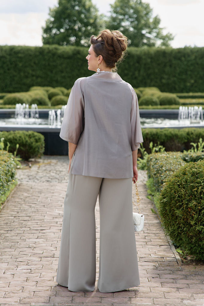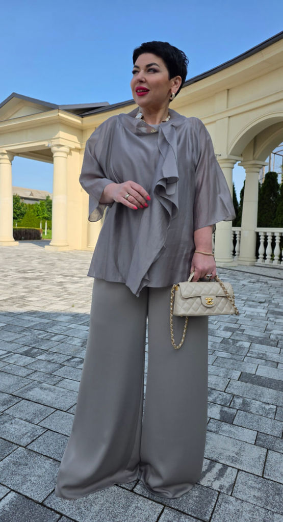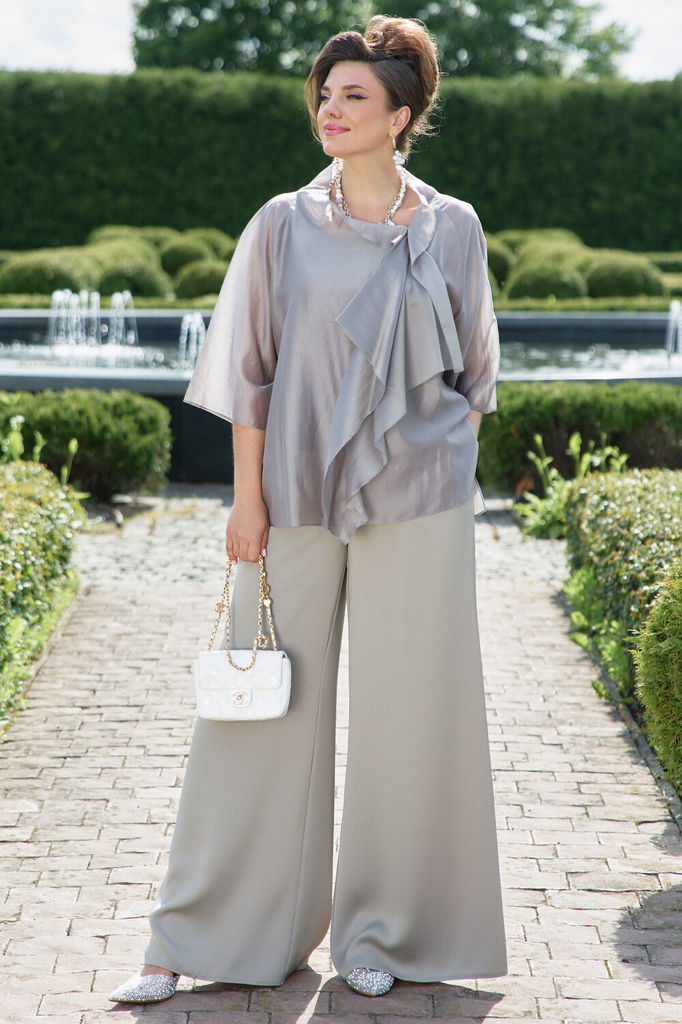 Состав: Блуза: ПЭ-15%; Лиоцелл-85%; Брюки: ПЭ-100%; Модель отшивается под заказ. Срок пошива от 3 недель. Элегантный брючный костюм, выполненный в мерцающем оттенке, который идеально подходит для созд... Показать описаниеания утонченных образов. Комплект состоит из свободной блузы широких брюк палаццо, обеспечивая непревзойденный комфорт и легкость движений. Блуза привлекает внимание своим асимметричным дизайном с драпировками и широким, ниспадающим воротником, который придает образу динамичность и изысканность. Блуза свободного силуэта, с двойными деталями переда и спинки. Головина округлой формы. Рукав в блузе реглан, длиной ?, что добавляет силуэту легкости и воздушности. В боковых швах блузы разрезы. Брюки с высокой посадкой и струящимся кроем визуально удлиняют ноги, создавая безупречный и гармоничный ансамбль. Этот костюм идеально подходит как для торжественных мероприятий, так и для деловых встреч, подчеркивая ваш безупречный вкус и чувство стиля. Длина блузы по спинке 68 см. Длина рукава блузы 48 см (р 50-54), 49 см (р 56-60). Длина брюк по боковому шву 108см (р 50-56), 108,5 см (р 58-60). Блуза 50 52 54 56 58 60 обхвт груди 120 124 128 132 136 140 обхват бедер 128 132 136 140 144 148 длина рукава 48 48 48 49 49 49 длина по спинке 68 68 68 68 68 68 Брюки 50 52 54 56 58 60 длина по боковому шву 108 108 108 108 108,5 108,5 ширина уровне среднего шва 120 124 128 132 136 140 ширина по линии талии 76/110 80/114 84/118 88/122 92/126 96/130