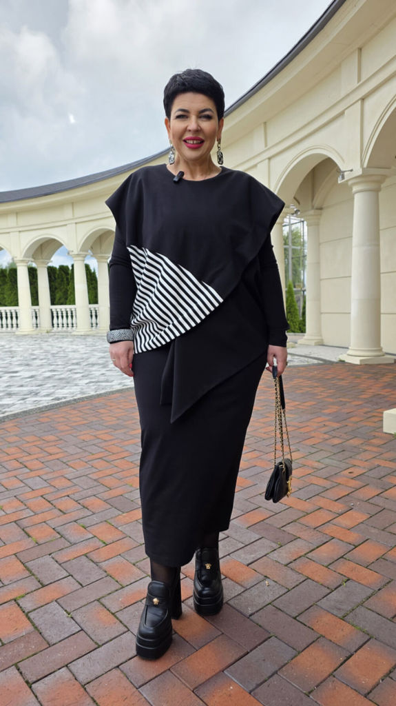 Состав: Джемпер: Вискоза-60%; Спандекс-5%; ПА-35%; Платье: Вискоза-60%; Спандекс-9%; Нейлон-31%; Модель отшивается под заказ. Срок пошива от 3 недель. Комплект женский, состоящий из джемпера и платья.... Показать описание Асимметричный джемпер, объемный, его оверсайз-силуэт делает образ дерзким и одновременно изысканным. Горловина округлой формы, линия плеча спущена, линия проймы углублённая. По переду джемпера декоративная отлетная складка, фигурный подрез со вставкой из отделочной ткани в полоску преходящая на спинку. Низ завершает отлетная деталь — неструктурированный волан, который живет своей жизнью, колышется при каждом шаге, добавляя динамики и легкости массивному верху. Он не пришит намертво, он «отлетает», создавая ощущение незавершенности и художественного хаоса. Спинка в джемпере с застёжкой на декоративную тесьму молнию в среднем шве, декоративным подрезом. Низ спинки джемпера фигурной формы. Платье прилегающего силуэта, длины миди. Горловина округлой формы. Рукав в платье втачной. Спинка без особенностей. Длина миди и длинные рукава платья создают изящный и лаконичный силуэт.Длина платья 121 см (р.50-54), 121,5 см (р.56-60), длина рукава платья 64 см. Длина джемпера 55 см, длина по плечу 24,5 см (р.50-56), 26,5 см (р.56-60). Джемпер 50 52 54 56 58 60 длина изделия 55 55 55 55 55 55 ширина изделия на уровне проймы 158 158 158 170 170 170 обхват бедер 119 119 119 131 131 131 длина рукава 24,5 24,5 24,5 26,5 26,5 26,5 Платье 50 52 54 56 58 60 длина изделия по спинке 121 121 121 121,5 121,5 121,5 обхват груди 100 104 108 112 116 120 обхват талии 96 102 106 110 114 118 обхват бедер 113 117 121 125 129 133