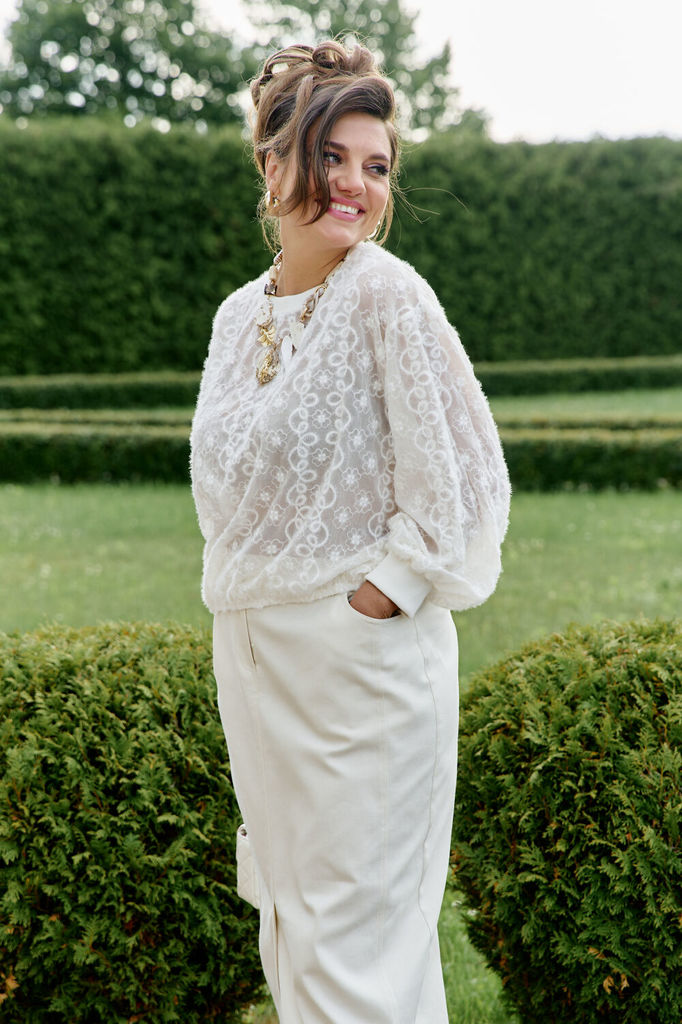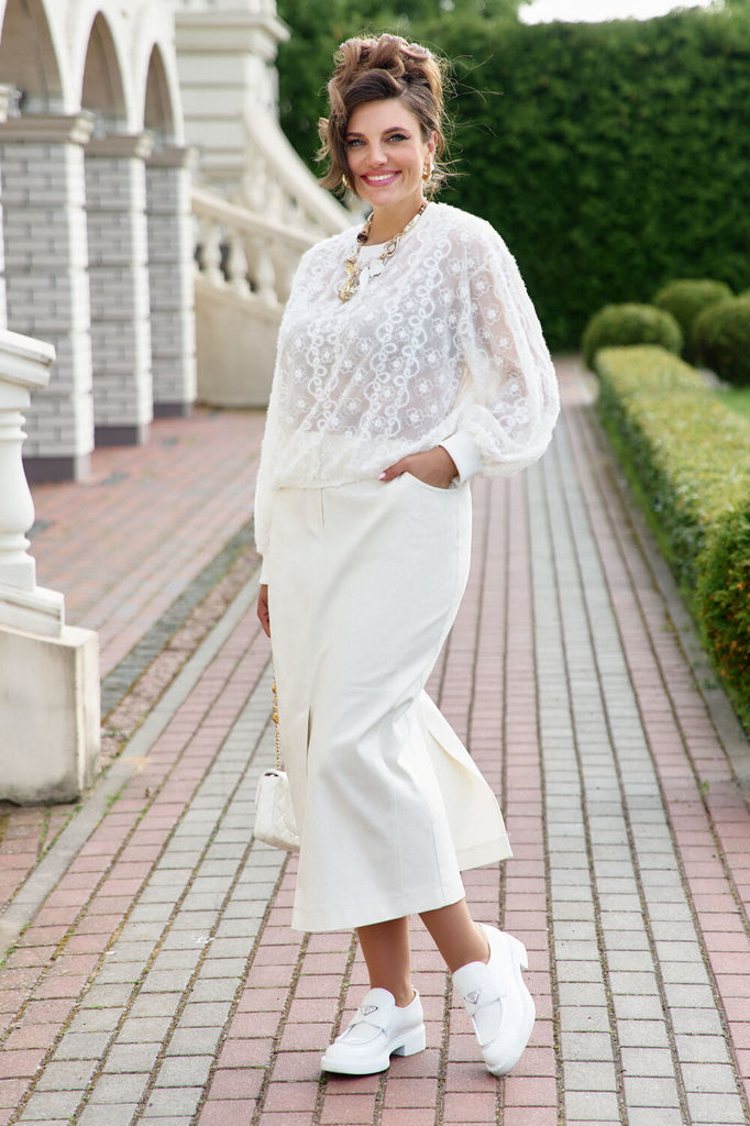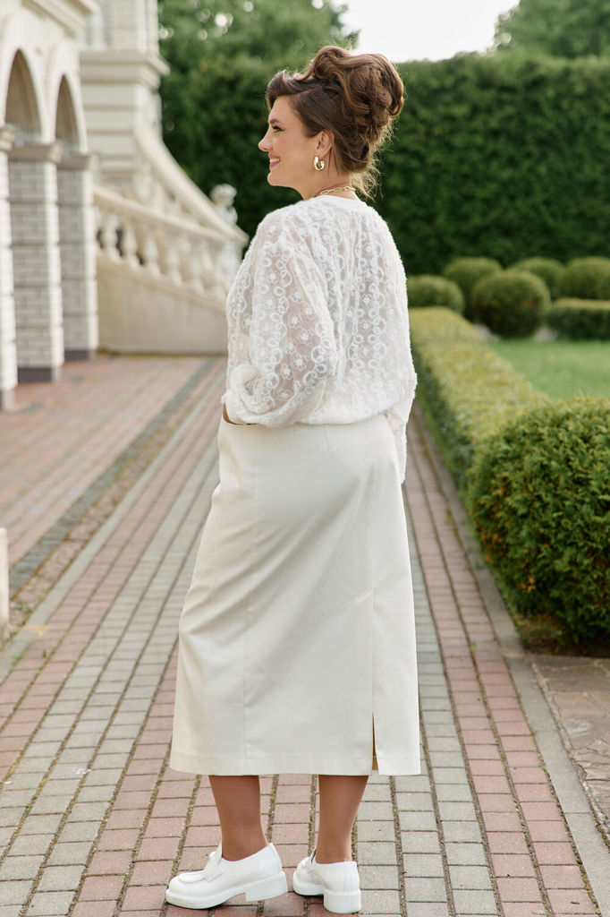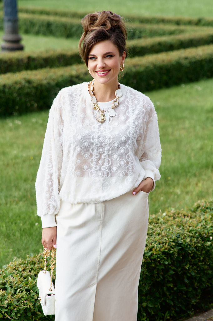 Состав: Костюм: Хлопок-100%; Подкладка: Хлопок-100%; Модель отшивается под заказ. Срок пошива от 3 недель. Женский летний костюм из легкой однотонной ткани в сочетании с изысканным ришелье олицетворяе... Показать описаниет утонченность и свежесть. Блузка струится по телу, придавая образу невесомость. Её простота подчеркивает изящество форм, а акцент на деталях добавляют эффекта романтичности. Этот летний комплект становится настоящим обаянием, который притягивает взгляды окружающих, придавая каждой женщине уверенность и шарм. Костюм идеально подходит как для прогулок по солнцу, так и для вечерних встреч в уютных кафе, даря своему обладателю ощущение легкости и свободы. Блуза свободного прямого силуэта, с округлой формой горловины, линия плеча спущенная с отложной манжетой по низу фиксируется декоративной пуговицей в качестве отделки. Спинка в блузе с отрезной кокеткой из отделочной ткани ришелье, на просвет, декоративной застёжкой на петли пуговицы. Низ в блузе ассиметричный с разрезами в боковых швах и пришивным декоративным элементом по низу переда. Юбка выполненная в трапециевидном силуэте, плавно ниспадает от талии, создавая ощущение легкости и свободы. Юбка из ришелье добавляет текстуру и эффектный контраст с однотонным верхом. Верхняя часть юбки с отрезной кокеткой, вставкой венгерки по задней детали, декоративными шлёвками и шнуром от боковых швов. В боковом шве юбки застёжка на потайную тесьму-молнию. По низу юбки притачной волан с разведением и декоративными разрезами по переду. Обращаем Ваше внимание, что фурнитура может незначительно отличаться от фото. Длина блузки 59 см(р.50-54) 59,5 см (р.56-60), длина рукава(плеча) 25,5 см(р.50-54), 28,5 см (р.56-60) . Длина юбки 84 см. блузка 50 52 54 56 58 60 обхват груди 117 121 125 129 133 137 обхват талии ширина на уровне линии бедер 122 126 130 134 138 142 ширина рукава внизу 45 45 45 49 49 49 юбка 50 52 54 56 58 60 ширина по талии с резинкой 80 84 88 92 96 100 ширина по талии без резинки 88 92 96 100 104 108 ширина на уровне линии бедер 117 121 125 129 133 137