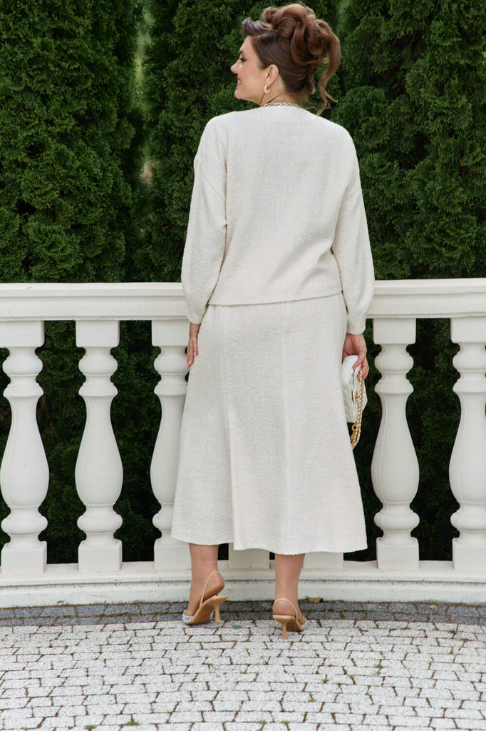 Состав: Костюм: Вискоза-9%; ПЭ-24%; Хлопок-35%; Акрил-32%; Подкладка: ПЭ-100%; Модель отшивается под заказ. Срок пошива от 3 недель. Безумно красивый и элегантный костюм в модном оттенке «сливочного м... Показать описаниеасла» мягко обволакивает фигуру, создавая тем самым шикарный образ. Костюм состоит из блузона свободного силуэта и юбки длины «миди» в силуэте «гадэ». Блузон свободного силуэта, с округлой формой горловины, линия плеча спущенная. Рукав втачной, длинный с застроченными вытачками от низа. Спинка в блузоне без особенностей.Юбка силуэта « гадэ» длины миди, обеспечивает мягкое прилегание по бёдрам, дарит комфорт подчёркивая фигуру благодаря крою. Пояс в юбке притачной, со вставкой эластичной тесьмы-резинки в бочках пояса. По переднему и заднему полотнищу юбки- вертикальные рельефы. В среднем шве юбки застёжка на потайную тесьму-молнию и пуговицу в поясе. Юбка на подкладке. Длина блузы по спинке 59 см (р 50-54), 61,5 см (р 56-60), длина рукава 45 см (р 50-54), 43 см (р 56-60). Длина юбки 88 см. Блуза 50 52 54 56 58 60 обхват груди 114 118 122 126 130 134 ширина изделия внизу 114 118 122 126 30 134 длина по спинке 59 59 59 61,5 61,5 61,5 Юбка 50 52 54 56 58 60 длина юбки 88 88 88 88 88 88 ширина по талии 80/94 84/98 88/102 92/106 96/110 100/114 ширина на уровне линии бедер 118 122 126 130 134 138
