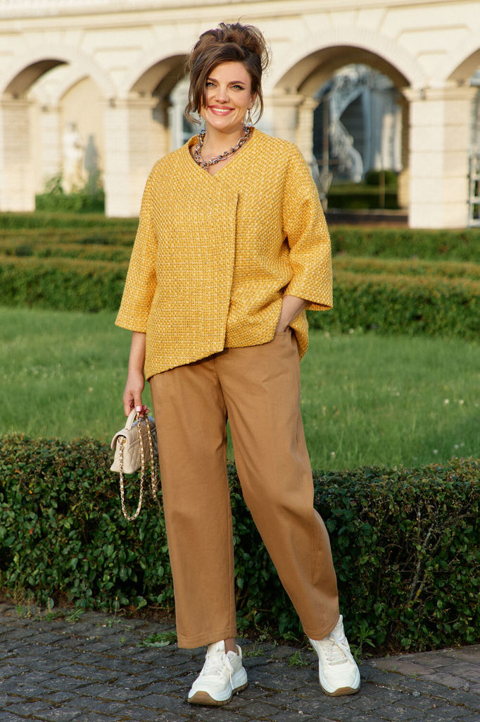 Состав: Вискоза-47%; Лён-53%; Модель отшивается под заказ. Срок пошива от 3 недель. Шикарный летний костюм, состоящий из блузы и прямых длинных брюк. Универсальный модный летний костюм станет отличным... Показать описание дополнением в Вашем гардеробе. Оттенок данного костюма будет отлично сочетаться оттенком загорелой кожи. Блуза свободного силуэта с округлой горловиной, спущенной линией плеча с отделкой из трикотажной сетки по низу рукава. По переду блузы отлетная планка от бокового шва, имитация накладного кармана; треугольная вставка по переду с отделкой из трикотажной сетки по низу. Низ в блузе ассиметричный. Спинка с отрезной кокеткой и отлетной планкой. Брюки прямого кроя с рельефами по переду. Пояс в брюках притачной на резинке. Низ в брюках фигурный. Изделие комплектуется декоративным съёмным украшением. Обращаем ваше внимание, что фурнитура может незначительно отличаться от фото. Длина блузы от высшей точки плечевого шва до низа 73,5 см (р.52-56), 74,5 см (р.58-62). Длина рукава от горловины 29-31 см (р.52-56), 32-34 см (р.58-62). Длина брюк по боковому шву от шва притачивания пояса 107 см. блуза 52 54 56 58 60 62 обхват груди 122 126 130 134 138 142 обхват талии ширина изделия на уровне линии бедер 131 135 139 143 147 151 ширина рукава внизу 46 46 46 50 50 50 брюки 52 54 56 58 60 62 ширина по линии талии в собранном виде 82 86 90 94 98 102 ширина по линии талии в растянутом виде 112 116 120 124 128 132 ширина на уровне среднего шва 122 126 130 134 138 142