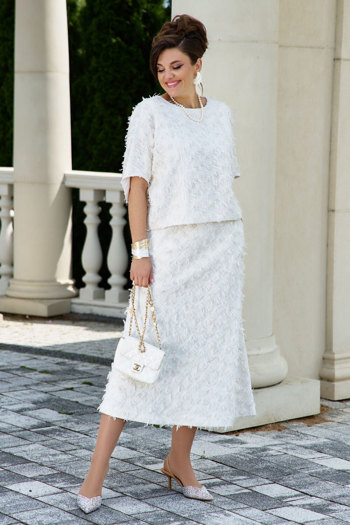 Состав: Костюм: ПЭ-53%; Хлопок-17%; Акрил-30%; Подкладка: ПЭ-100%; Модель отшивается под заказ. Срок пошива от 3 недель. Костюм антично-белого оттенка и серебристой нити с трендовым декором на л... Показать описаниеевом плече. В крупные металлические люверсы проходят цепи и жемчужная нить. Жакет прямого силуэта с нагрудной вытачкой из низа и бочком. Застёжка однобортная на две петли и пуговицы с V-образной горловиной без воротника. Рукав полной длины двухшовный пиджачный. Спинка жакета с двумя талиевыми выточками. Юбка прямая зауженная к низу длины миди по переду комфортная шлица, задняя часть юбки со средним швом и потайной молнией в верхней части также талиевые вытачки. Юбка имеет приточной пояс по боковой части на резинке, что придает комфорт. Топ выполнен из лёгкой шелковистой ткани. Передняя часть топа имеет нагрудную вытачку, горловина округлой формы. Бретель топа достаточно широкая что скрывает недостатки. Длина жакета по спинке 55 см (р 48-52), 55,5 см (р 54-58), длина рукава 61,5 см. Длина топа по спине 63 см. Длина рукава топа 8 см. Длина юбки 75 см (р 48-52), 76 см (р 54-58). Жакет 48 50 52 54 56 58 обхват груди 106 110 114 118 122 126 длина спинки 55 55 55 55,5 55,5 55,5 ширина изделия внизу 115 119 123 127 131 135 обхват талии 106 110 114 118 122 126 Юбка 48 50 52 54 56 58 длина юбки 75 75 75 76 76 76 ширина юбки по талии 78/92 80/96 84/100 88/104 92/108 96/112 ширина юбки на уровне бедер 113 117 121 125 129 133 Топ 48 50 52 54 56 58 обхват груди 103 107 111 115 119 123 обхват талии 103 107 111 115 119 123 ширина изделия на уровне бедер 110 114 118 122 126 130