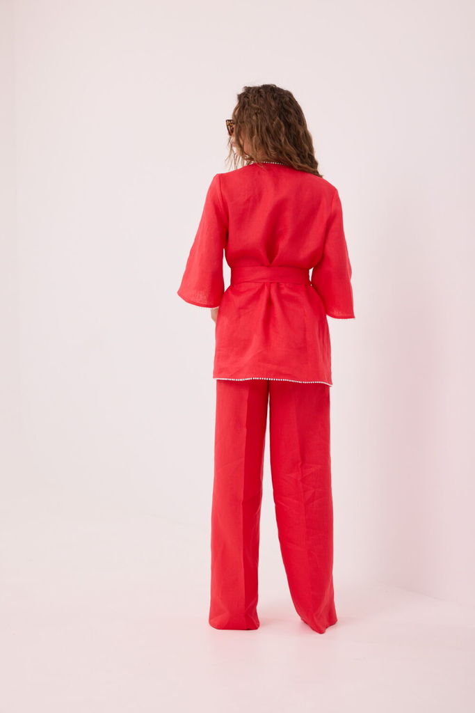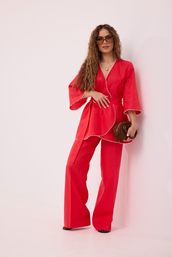 Состав: Лён-100%; Жакет мягкой формы из льняной ткани. Застежка на запах фиксируется на потайную пуговицу. Вырез горловины V-образной формы. Рукав расширен к низу, длина ниже локтя. В комплекте съемны... Показать описанией пояс на полукольцах. Борт, низ изделия и рукава отделаны декоративной тесьмой. Длина жакета 75 см. Длина рукава 42 см. Ширина плечевого шва - 12,5 см. Измерения по готовому изделию: 42 р-р: ОГ - 94 см., ОТ - 92 см., ОБ - 96 см. 44 р-р: ОГ - 98 см., ОТ - 96 см., ОБ - 100 см. 46 р-р: ОГ - 102 см., ОТ - 100 см., ОБ - 104 см. 48 р-р: ОГ - 106 см., ОТ - 104 см., ОБ - 108 см. 50 р-р: ОГ - 110 см., ОТ - 108 см., ОБ - 112 см. 52 р-р: ОГ - 114 см., ОТ - 112 см., ОБ - 116 см.