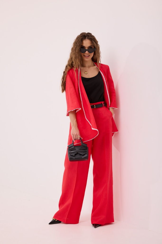Состав: Вискоза-55%; Лён-45%; Жакет мягкой формы из льняной ткани. Жакет с запахом, фиксируется по талии съемным поясом. Рукав ?, расширен книзу. По горловине, борту, низу изделия и низу рукава декора... Показать описаниетивная тесьма. Длина жакета 75 см. Длина рукава 42 см. ширина плеча - 12,5 см. Измерения по готовому изделию: 44 р-р: ОГ - 104 см., ОТ - 101 см., ОБ - 106 см. 46 р-р: ОГ - 108 см., ОТ - 105 см., ОБ - 110 см. 48 р-р: ОГ - 112 см., ОТ - 109 см., ОБ - 114 см. 50 р-р: ОГ - 116 см., ОТ - 113 см., ОБ - 118 см. 52 р-р: ОГ - 120 см., ОТ - 117 см., ОБ - 122 см.