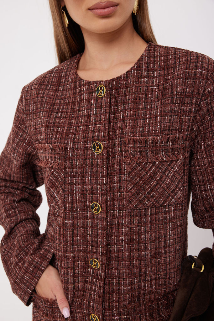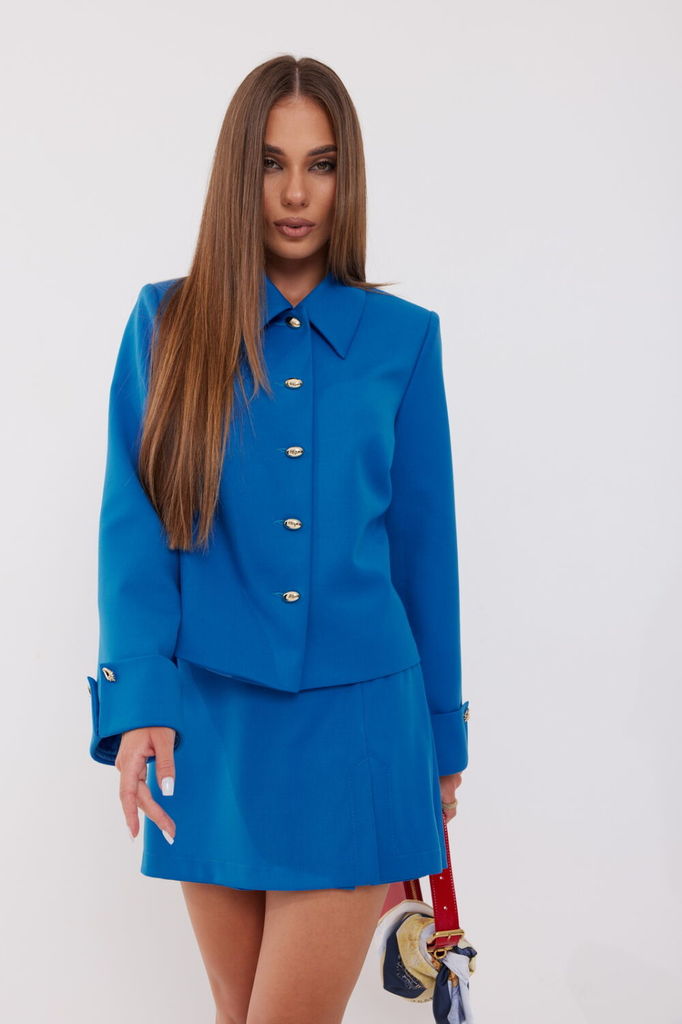 Состав: Вискоза-20%; ПЭ-76%; Спандекс-4%; Жакет укороченный прямого силуэта на подкладке. Застежка на петли и пуговицы. Рукав прямой, одношовный с манжетой украшенной декоративными пуговицами. Воротни... Показать описаниек отложной. По переду нагрудные вытачки. Длина жакета 44-48 р-р: 51 см. 50-52 р-р: 53 см. Длина рукава 61 см. Измерения по готовому изделию: 44 р-р: ОГ - 96 см., ОБ - 102 см. 46 р-р: ОГ - 100 см., ОБ - 106 см. 48 р-р: ОГ - 104 см., ОБ - 110 см. 50 р-р: ОГ - 108 см., ОБ - 114 см. 52 р-р: ОГ - 112 см., ОБ - 118 см.