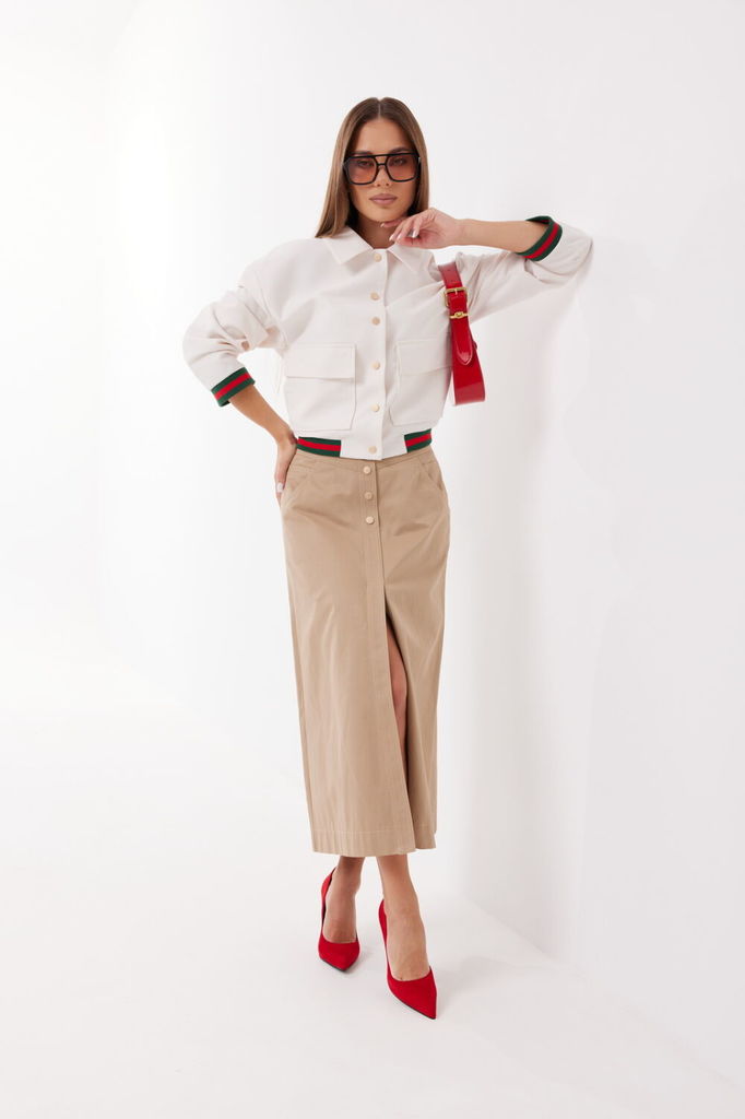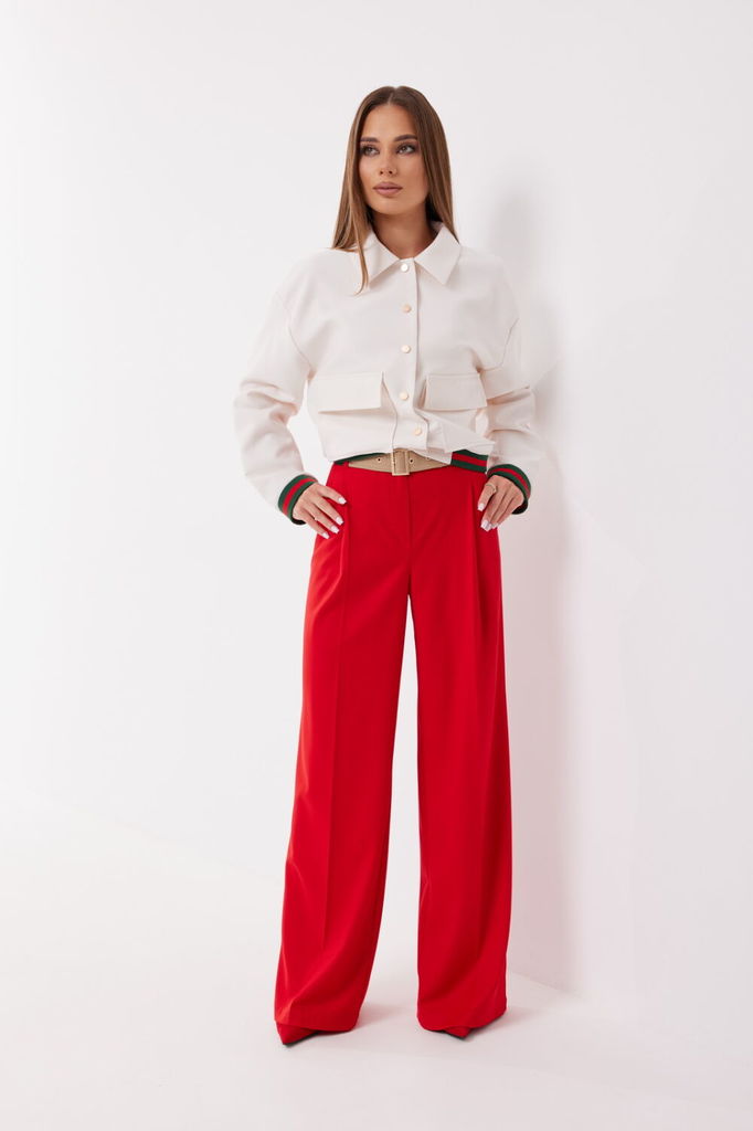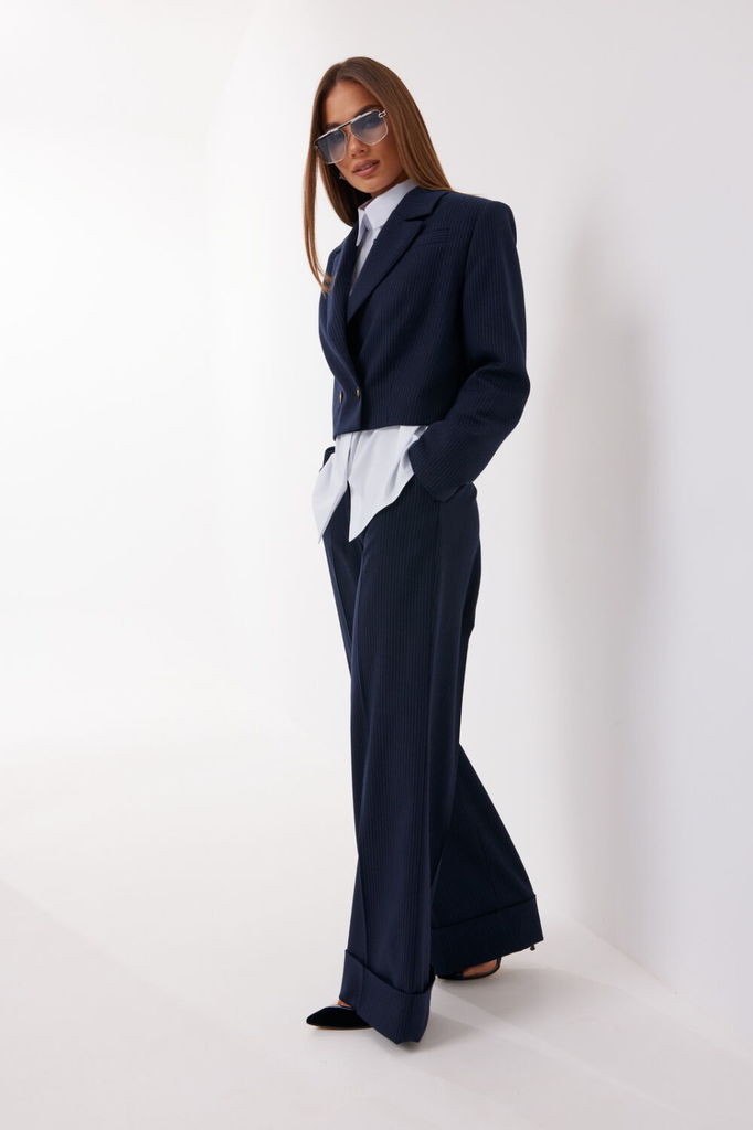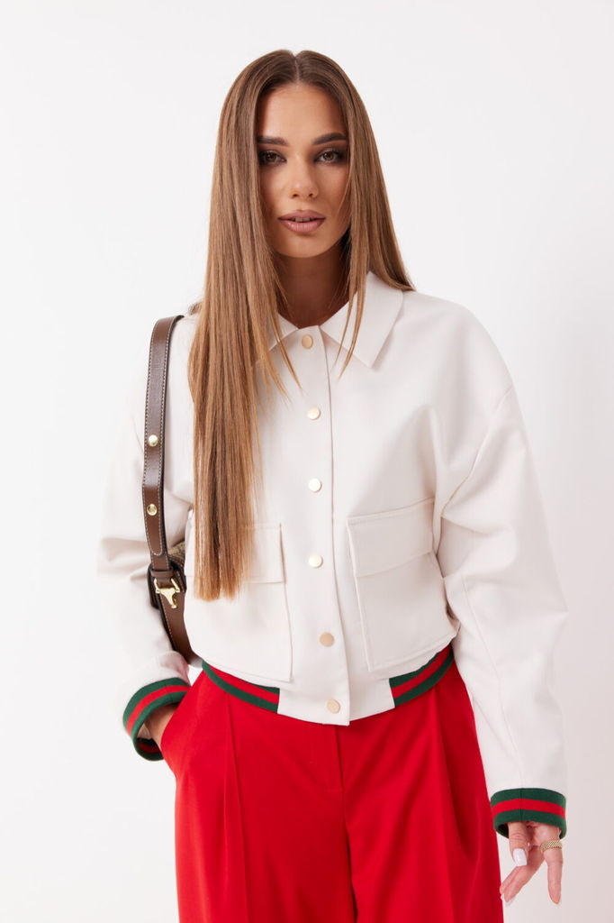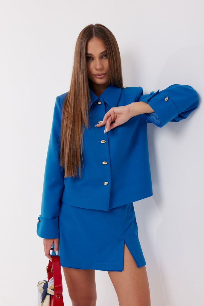 Состав: Вискоза-20%; ПЭ-76%; Спандекс-4%; Жакет укороченный из костюмной ткани. Застёжка по переду на кнопки. По переду накладные карманы с клапаном. Воротник отложной. Рукав прямой на трикотажной ма... Показать описаниенжете. Низ жакета на трикотажном поясе. Жакет на подкладке. Длина жакета 52 см. Длина рукава 75 см. Измерения по готовому изделию: 44 р-р: ОГ - 107 см., ОТ - 106 см., ОБ - (по трикот. поясу - 88 см.) 46 р-р: ОГ - 111 см., ОТ - 110 см., ОБ - (по трикот. поясу - 92 см.) 48 р-р: ОГ - 115 см., ОТ - 114 см., ОБ - (по трикот. поясу - 96 см.). 50 р-р: ОГ - 119 см., ОТ - 118 см., ОБ - (по трикот. поясу - 100 см.) 52 р-р: ОГ - 123 см., ОТ - 122 см., ОБ - (по трикот. поясу - 104 см.)