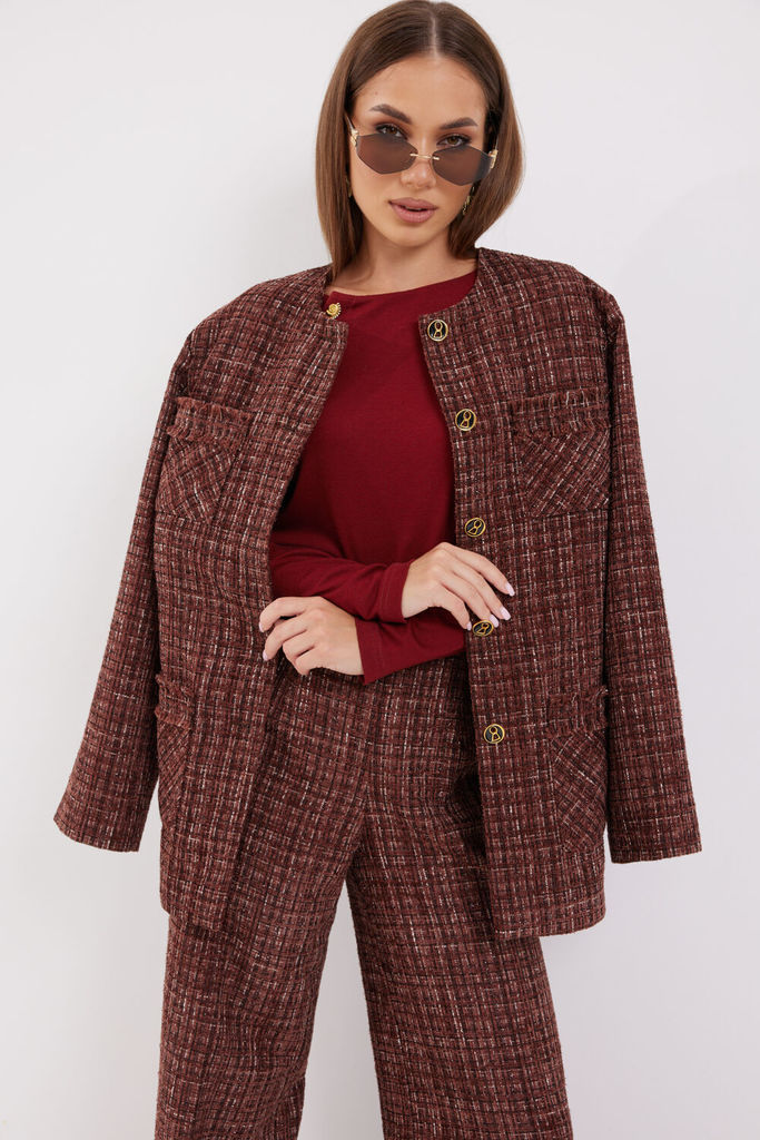 Состав: ПЭ-100%; Жакет в стиле Шанель- это изысканная и стильная верхняя одежда. Изготовлен из качественного материала, однобортный, прямого силуэта, на подкладке. Рукава втачные, одношовны... Показать описаниее. Горловина круглая, застежка на петли и пуговицы. По переду накладные карманы. Длина жакета 76 см. Длина рукава 61 см. Измерения по готовому изделию: 44 р-р: ОГ - 98 см., ОБ - 104 см. 46 р-р: ОГ - 102 см., ОБ - 108 см. 48 р-р: ОГ - 106 см., ОБ - 112 см. 50 р-р: ОГ - 110 см., ОБ - 116 см. 52 р-р: ОГ - 114 см., ОБ - 120 см.