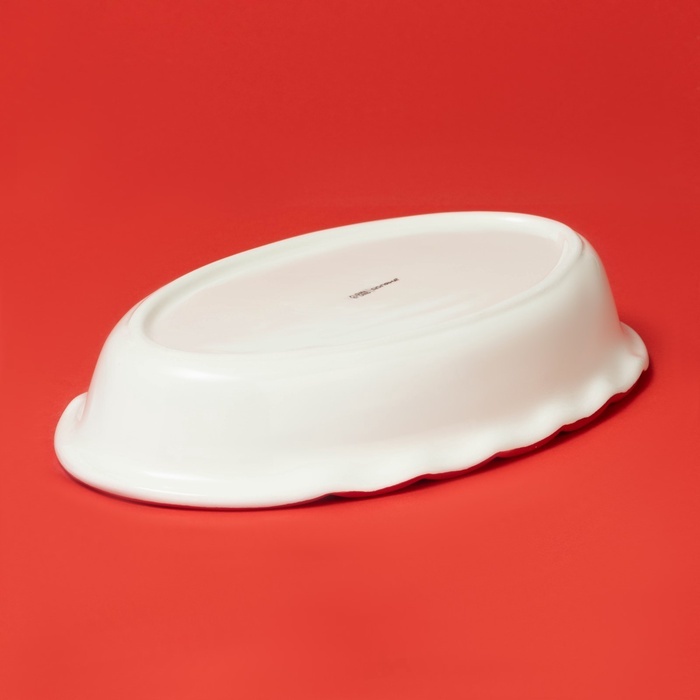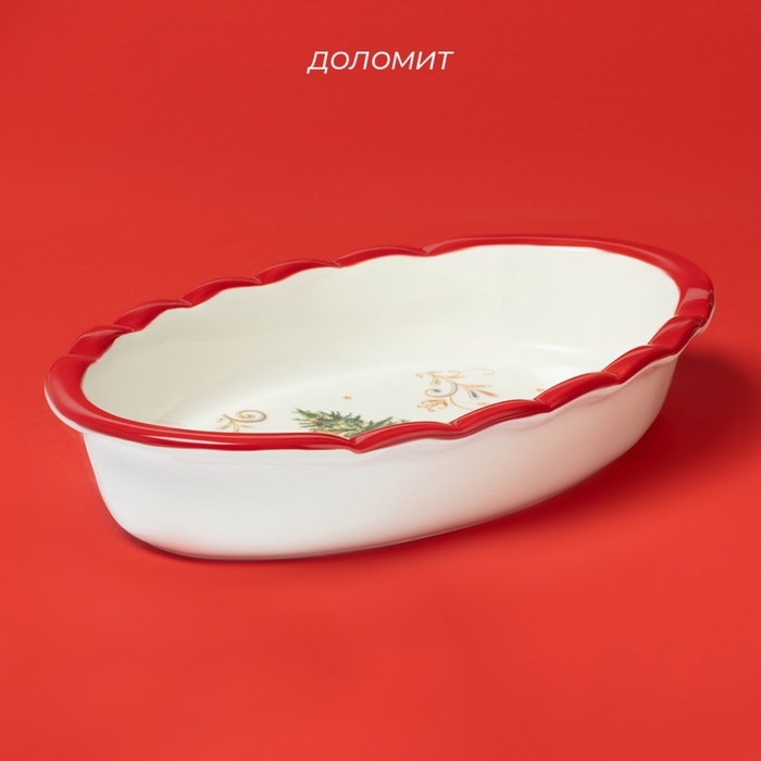 Новогоднее блюдо для запекания Волшебное дерево — не просто форма, а начало праздника ещё до первого гостя. Овальный силуэт вмещает пирог, запеканку или рулет — и превращает их в центр стола. Белый фо... Показать описаниен и красные акценты работают как классическая пара: сдержанно, но выразительно. Рисунок ёлки не бросается в глаза — он возвращается в них, когда гости начинают фотографировать. Это не посуда для духовки — это посуда, с которой начинается атмосфера. Особенности * Размер 28?17,5?4,9 см — вместительное, но не громоздкое; подходит для семейного застолья. * Форма — овал: равномерно распределяет тепло, подчёркивает форму блюда, а не скрывает её. * Деколь с праздничной ёлкой — не стирается, не выгорает, не конфликтует с едой. * Материал — доломит: выдерживает высокую температуру до 200 градусов, сохраняет тепло. * Цветовая гамма — белый с красным: новогодняя классика без излишеств, без китча. * Ручной уход — не для посудомоечной машины, только мягкая губка и тёплая вода. Почему его достают раньше, чем включают духовку Потому что оно задаёт тон. Не только блюду — всему дню. Его ставят на стол ещё пустым — и уже видно: сегодня будет по-домашнему, по-настоящему. После запекания его не прячут — оставляют на виду, даже если внутри уже ничего нет. Волшебное дерево не требует снега. Оно работает тише: через тепло, через форму, через то, как на него смотрят перед тем, как начать есть.