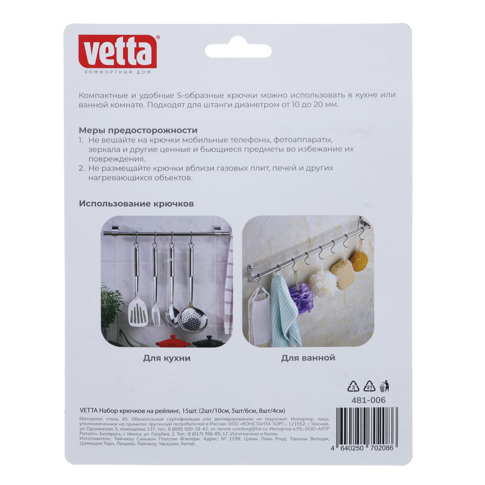 VETTA Набор крючков на рейлинг, 15шт. (2шт/10см, 5шт/6см, 8шт/4см)Вопросы по товару