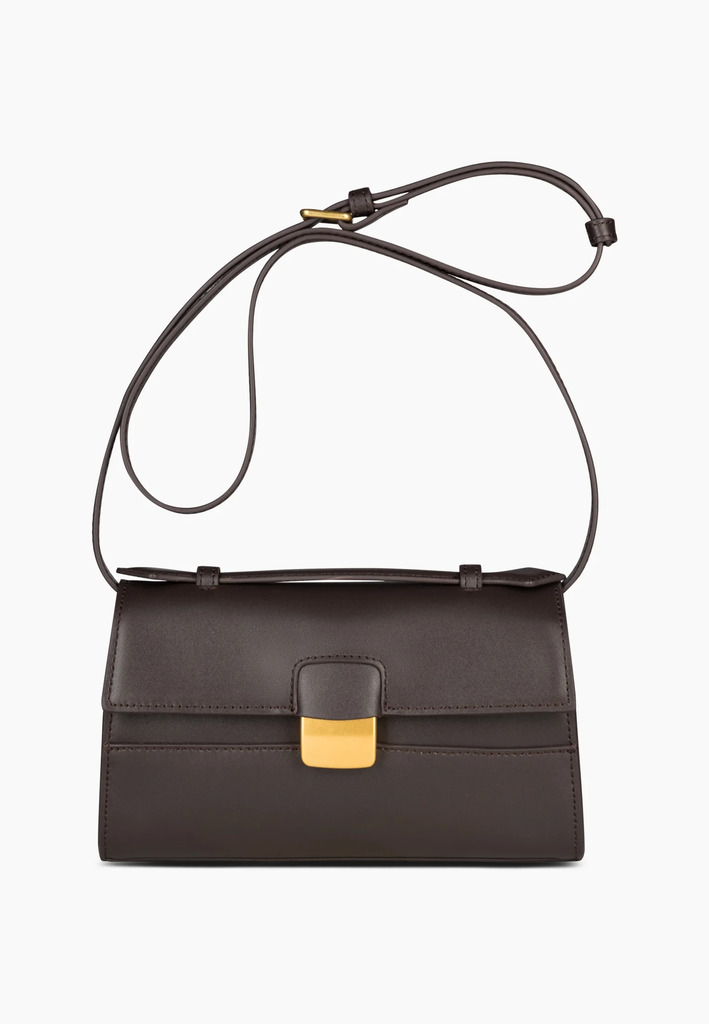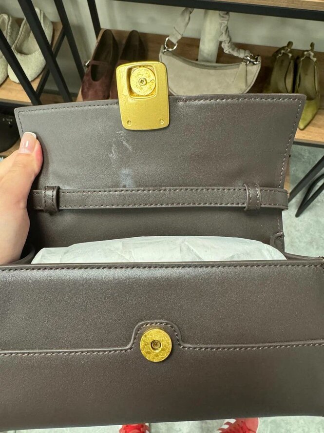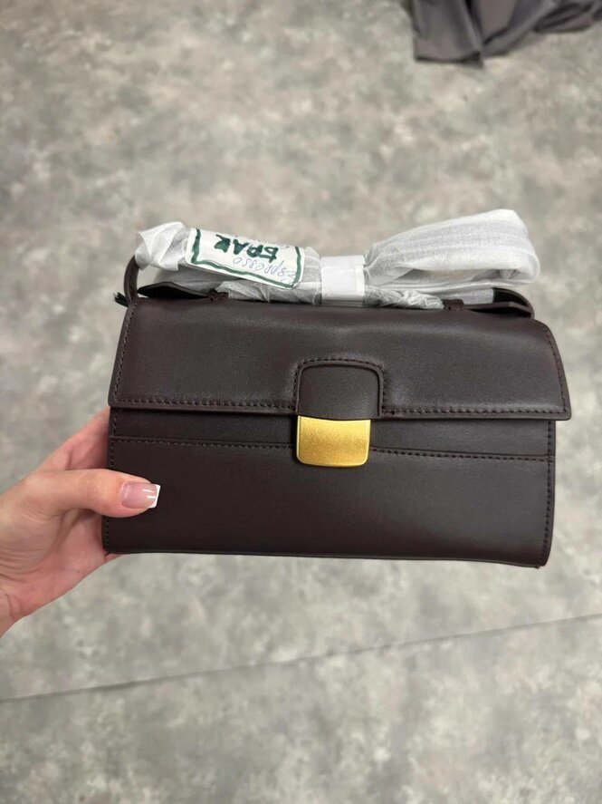 БРАК - след внутри сумки. Сумка изящного среднего размера цвета бодрящего эспрессо изготовлена из натуральной мягкой матовой кожи. Благодаря своим размерам и форме сумка станет вашей надежной спутнице... Показать описанией как в повседневной жизни, так и на вечерних выходах. Сумка закрывается клапаном с акцентной металлической застежкой нейтрального золотого цвета. В неё легко поместятся ключи, смартфон, документы, кошелек и косметика. Сумку можно носить как кросс боди с длинным узким ремнем с регулировкой размера, или как клатч с короткой ручкой. Высота: 112 см. Ширина: 22см. Ширина дна: 5 см. Длина ремня с регулировкой размера без учета фурнитуры: 100 см.