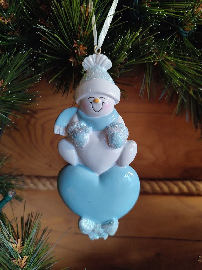 FM Елочное украшение Малыш снеговик с сердцами. Цвет голубой 12х5,5х1,5 см.