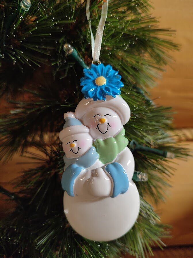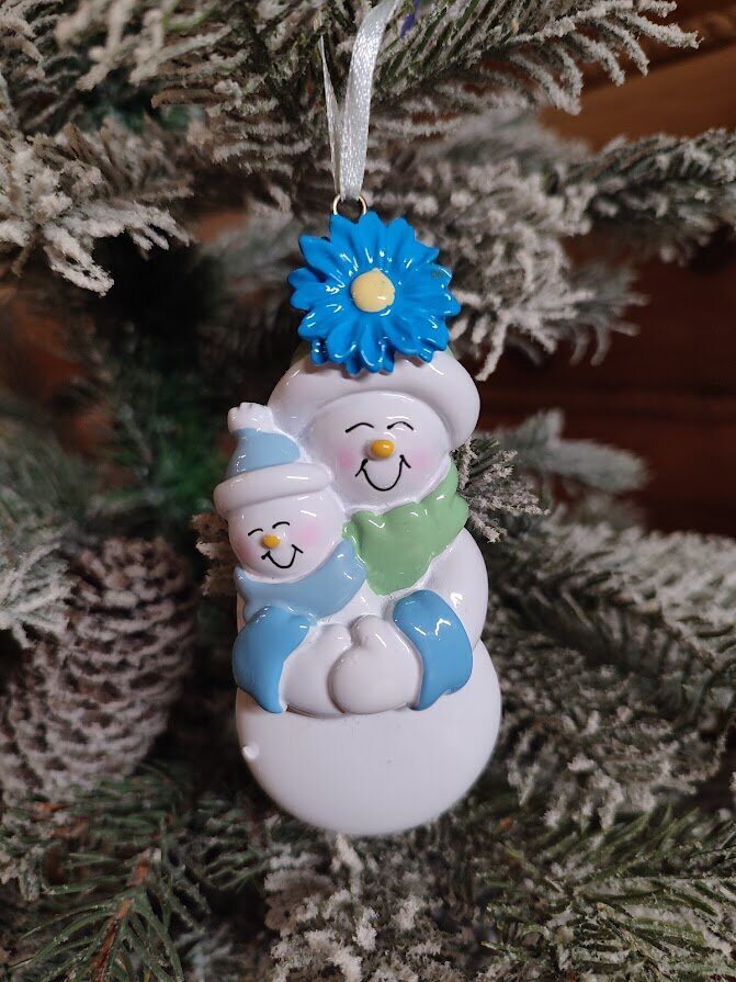 FM Елочное украшение Мама снеговик с малышом, полистоун, 10х4,5х2 см. Белый/голубой.