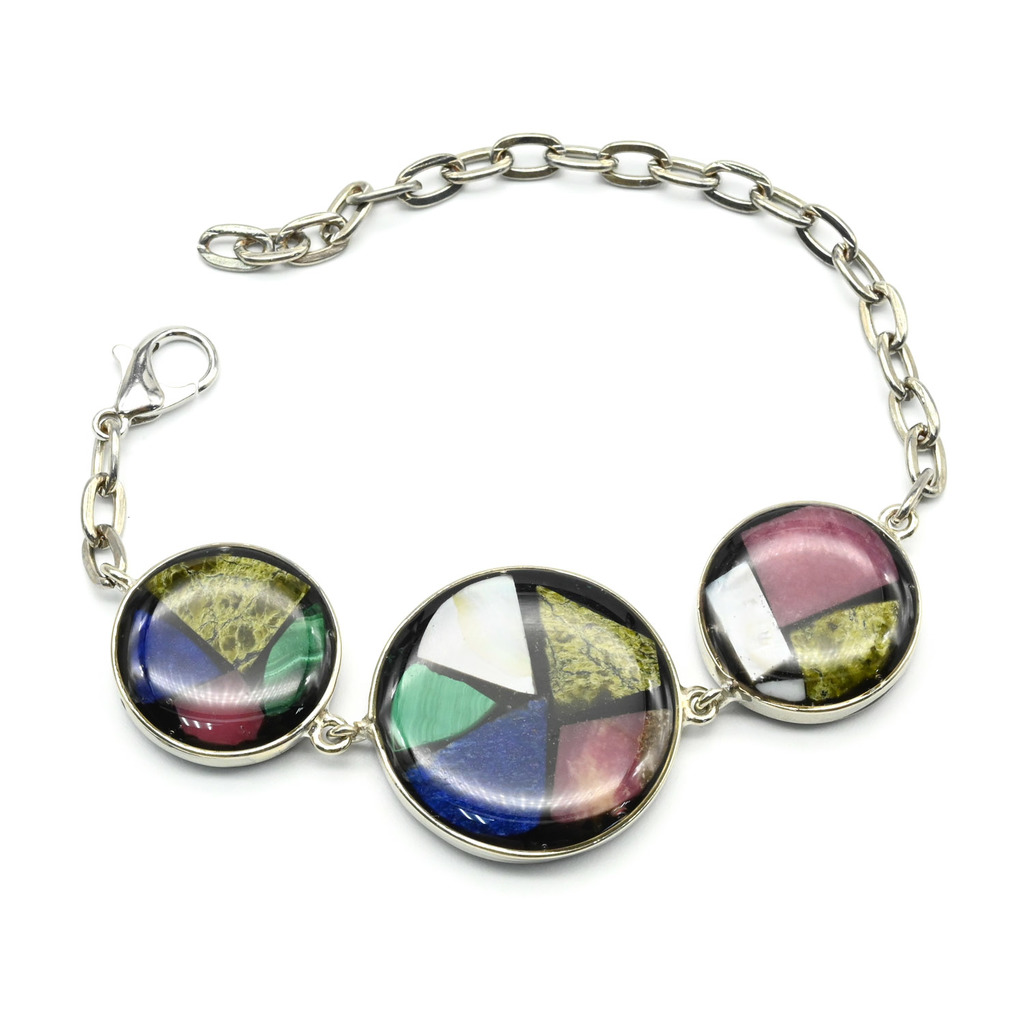 Материал: Самоцветы-Миксы Натуральность: Натуральный камень Месторождение: Россия Основание: Нейзильбер •Авторское украшение выполнено в стиле флорентийской мозайки ручной работы. •Форма и рисунок кам... Показать описаниеня никогда не повторяются, что делает данное изделие единственным в своем роде. •Размер центрального камня 28*36 мм. •Длина браслета увеличивается за счет цепочки 3см. •Камни в мозаике: лазурит, хризоколла, хризопраз, кахолонг, эвдиалит, агат, апатит.