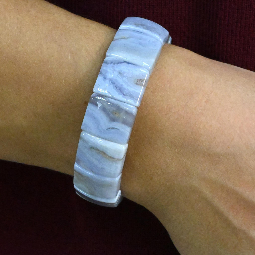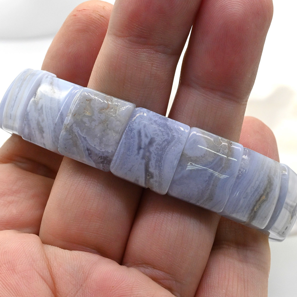 Материал: Агат голубой Натуральность: Натуральный камень Месторождение: Намибия Основание: Камень •Браслет собран на прочную резинку. •Длина браслета 17-18см. •Размер сегмента: 16*14 ± 0,5мм. •В наиме... Показать описаниеновании указан средний вес. •На поверхности камня допустимо присутствие природных прожилок и раковин, что свойственно натуральному камню. •Цвет и рисунок камня может незначительно отличаться от экземпляра, представленного на фотографии.
