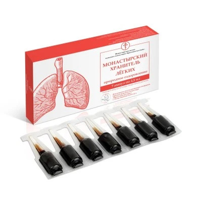 Сочетание отвара лекарственных растений и кавказского мёда полезно для работы лёгких, способствует восстановлению органов после COVID-19 и облегчению симптоматики, может обеззараживать горло, препятст... Показать описаниевуя простудным заболеваниям, улучшая дыхание и помогая избавиться от кашля, обладает антисептическим и отхаркивающим эффектом. Это концентрация пользы для всей семьи в одной ампуле. Травы, из которых приготовлен монастырский эликсир «Хранитель лёгких», помогают облегчить дыхание, борются с симптомами кашля, применяются при бронхите, обладают отхаркивающим и болеутоляющим свойствами. Содержание эвкалипта в составе эликсира обеззараживает горло, препятствуя простудным заболеваниям. Корни солодки и цветки ромашки способствуют постепенному выводу мокроты из горла, устранению симптоматики кашля и облегчению протекания болезни. Компоненты полезны при восстановлении после отказа от курения, улучшают дыхание, помогают избавиться от кашля. Входящие в состав эликсира компоненты способствуют восстановлению организма после тяжёлой болезни, такой как грипп, ангина или коронавирус, улучшают самочувствие и физическое состояние. Благодаря полезным свойствам отвар способствует быстрому разжижению собравшейся в дыхательных путях мокроты, облегчает отхаркивание, оказывает положительное влияние на лёгкие и выступает в качестве профилактики от вирусных заболеваний, таких как COVID-19 и грипп. Состав: Структурированная вода, кавказский мёд, сахар, высококонцентрированный отвар кавказкой мяты перечной, клеточного сока пихты кавказской, корневища и корней девясила, травы чабреца, листьев эвкалипта прутовидного, корней солодки, цветков ноготков, цветков ромашки, натуральный консервант (лимонная кислота). Способ применения: Утром натощак 1 раз в день за 40 минут до приёма пищи или через 2 часа после. Раскройте ампулу с одной стороны, содержимое добавьте в 100 мл тёплой воды, дайте эликсиру настояться 2 минуты и выпейте. Разовая доза составляет 2,5 мл (1 ампула). Средство разрешено детям от 3-х лет 1 раз в день утром натощак. Курс для детей и взрослых составляет 14 дней без перерыва, на курс понадобится 2 упаковки. Для повтора одного и того же курса следует сделать перерыв 2 недели. В это время можно начать приём других ампул. Описание серии: Монастырская продукция изготавливается по монастырским рецептам из древних летописей и по народным преданиям, которые передавались из поколения в поколения. Мы изготавливаем монастырскую продукцию по благословению двух монастырей. Противопоказания: Индивидуальная непереносимость компонентов.