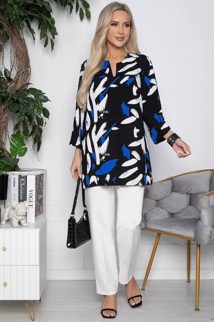 Артикул: Б9039. Ткань: трикотаж "Дорис". Состав: 98% п/э, 2% эластан. Цвет: сине-белый. Вид застежки: отсутствует. Силуэт: свободный. Карманы: отсутствуют. Тип горловины: полукруглый. Д... Показать описаниелина изделия по спинке: 44/ 52 см, 46/ 53 см, 48/ 55 см, 50/ 57 см, 52/ 58 см, 54/ 59 см. Рост модели: 170 см. Стильная блузка женская выполненная из мягкого и приятного на ощупь материала, она обеспечивает комфорт и свободу движения. Блузка женская станет незаменимой частью вашего образа и подойдет как для работы, так и для отдыха. Благодаря своему дизайну, блуза будет сочетаться с любыми брюками, юбками и джинсами, позволяя вам создавать множество модных ансамблей. Широкий размерный ряд позволяет носить блузу всем девушкам. Уход за изделием: ручная стирка до 30 градусов; нельзя отбеливать; деликатный отжим; гладить при t не более 110 С; гладить с изнанки. *Допуск отклонения длины при массовом производстве 1-3 см является нормой.