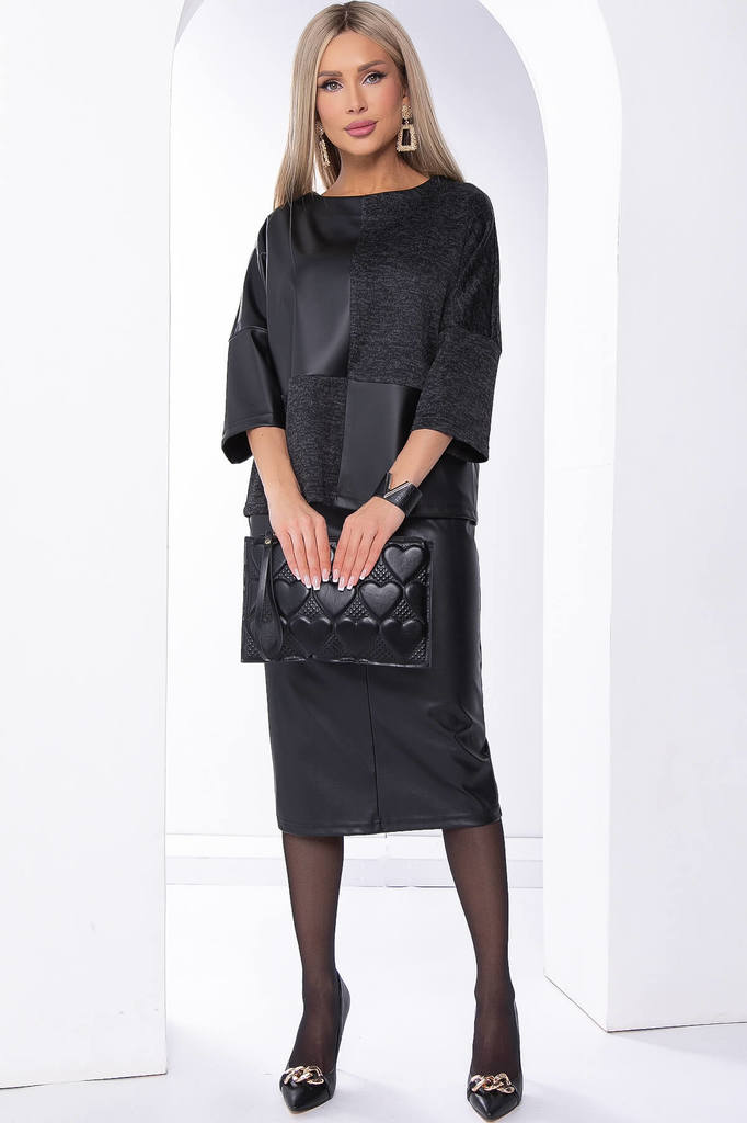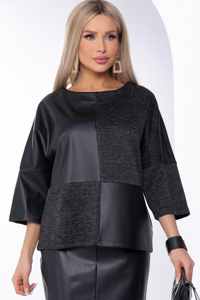 Артикул: Б8271. Ткань: трикотаж меланж, экокожа. Состав: 63% вискоза, 34% п/э, 3% эластан. Цвет: чёрный. Вид застежки: без застёжки. Силуэт: прямой. Карманы: отсутствуют. Тип горловины: ... Показать описание;лодочка. Длина изделия по спинке: 44/ 57 см, 46/ 58 см, 48/ 59 см, 50/ 60 см, 52/ 61 см, 54/ 62 см. Рост модели: 168 см. Универсальная модель джемпера, которая прекрасно подойдёт для дерзких повседневных образов. Рукав три четверти, свободный, со спущенным плечевым швом. Изделие будет отлично смотреться с юбками, брюками и лосинами. Создавай модные образы и чувствуй себя уверенно! Уход за изделием: ручная стирка до 30 градусов; нельзя отбеливать; деликатный отжим; гладить при t не более 110 С; гладить с изнанки. *Допуск отклонения длины при массовом производстве 1-3 см является нормой.