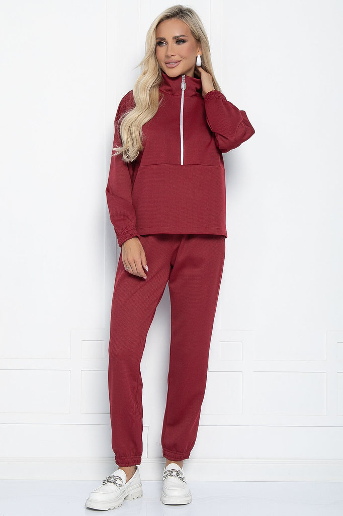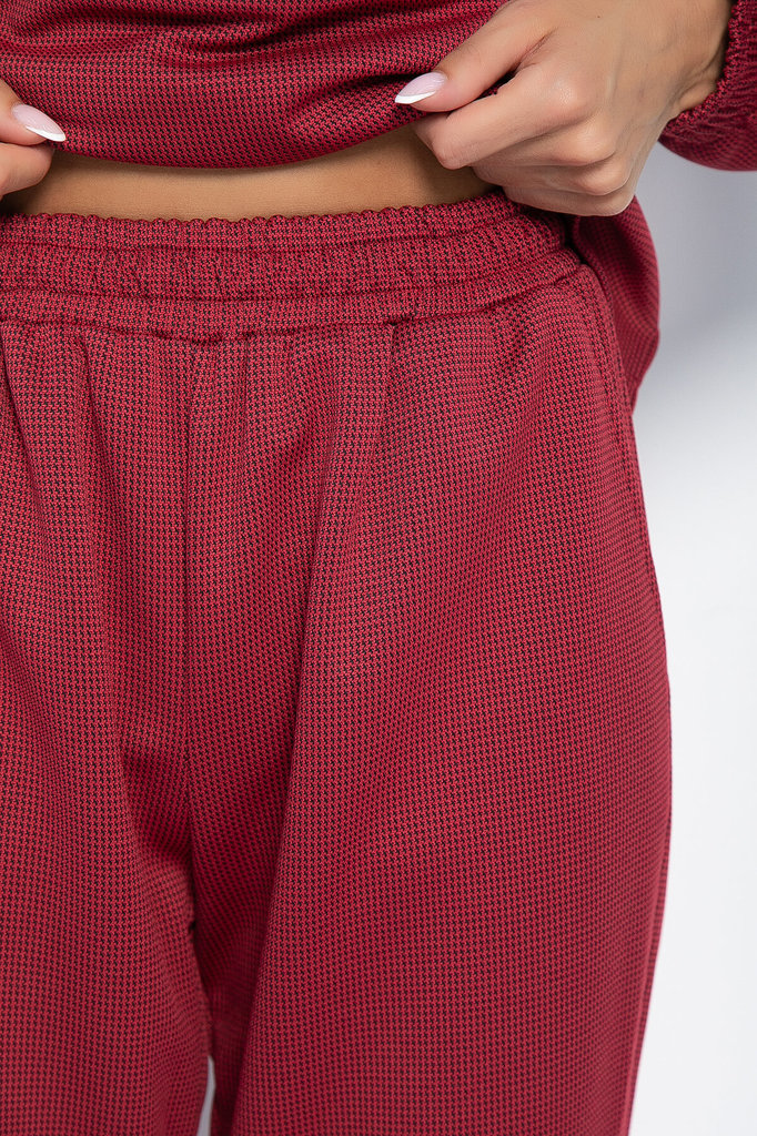 Артикул: К11082. Состав: 95% полиэстер, 5% эластан. Материал: костюмная. Цвет: бордовый. Принт: гусиная лапка мелкая. Вид застежки: молния. Карманы: есть. Силуэт: свободный. Декоративны... Показать описаниее элементы: отсутствуют. Длина верха: 44/ 57,5 см, 46/ 57,5 см, 48/ 59,7 см, 50/ 59,7 см. Длина рукава: 44/ 71 см, 46/ 72 см, 48/ 73 см, 50/ 74 см. Длина брюк: 44/ 97,5 см, 46/ 97,5 см, 48/ 98,5 см, 50/ 98,5 см. Размер изделия на модели: 44. Рост модели: 168 см. Повседневный костюм в стиле спорт-шик. Воротник-стойка, удобный спущенный рукав на резинке. Молния расстёгивается до груди, поэтому вы можете регулировать степень открытости груди. Брюки на эластичной манжете, чтобы можно было регулировать их длину. Есть брючные карманы. Уход за изделием: ручная стирка до 30 градусов; нельзя отбеливать; отжим запрещён; гладить при t не более 110 С; гладить с изнанки. Внимание! Рекомендуем ориентироваться на размерную сетку и выбирать свой привычный размер, согласно размерной таблице. *Допуск отклонения длины при массовом производстве 1-3 см является нормой.