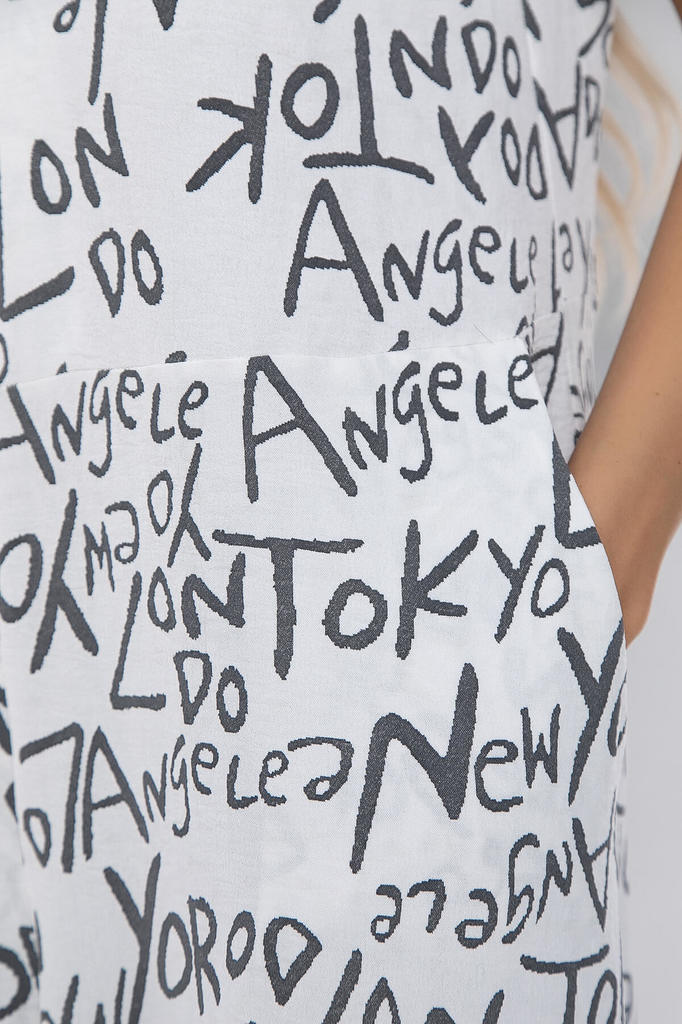 Артикул: К10074. Ткань: Сингапур. Состав: 83% п/э, 12% вискоза, 5% эластан. Цвет: белый. Принт: буквы. Вид застежки: потайная молния на груди. Силуэт: свободный. Карманы: есть. Длина ко... Показать описаниембинезона по спинке: 44-54/ 158 см. Рост модели: 168 см. Яркий комбинезон из лёгкой ткани идеально подойдёт для повседневного расслабленного образа. Свободный крой не сковывает движений и дарит комфорт. Рукав втачной, короткий. Акцент образу придает вырез, который идеально подчеркивает зону декольте. В таком комбинезоне вы точно не останетесь незамеченной! Уход за изделием: ручная стирка до 30 градусов; нельзя отбеливать; деликатный отжим; гладить при t не более 110 С; гладить с изнанки. *Допуск отклонения длины при массовом производстве 1-3 см является нормой.