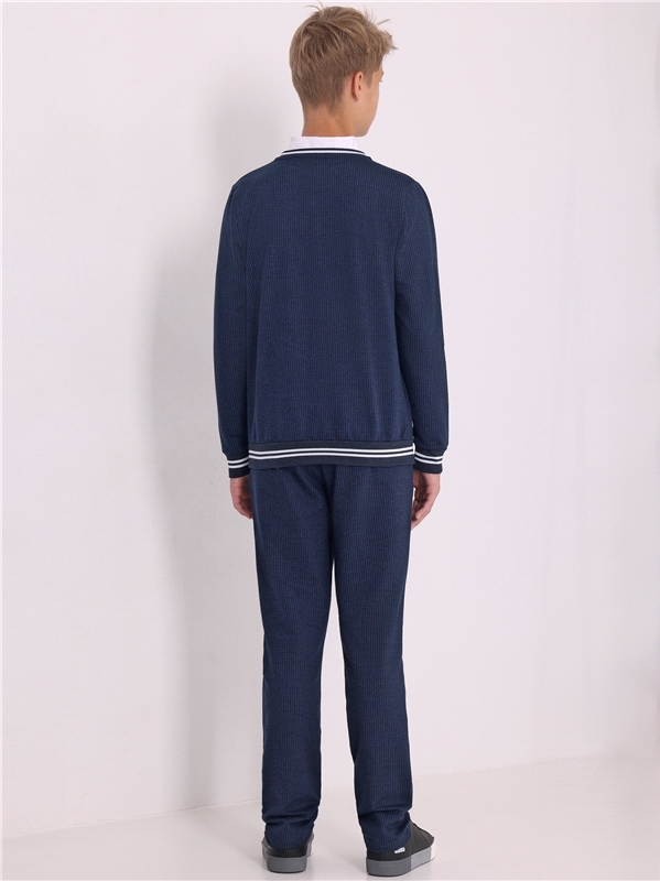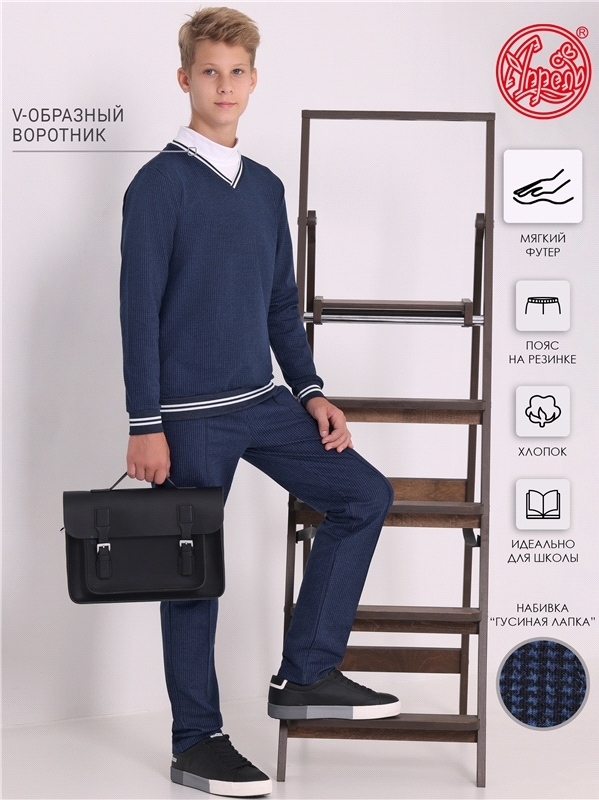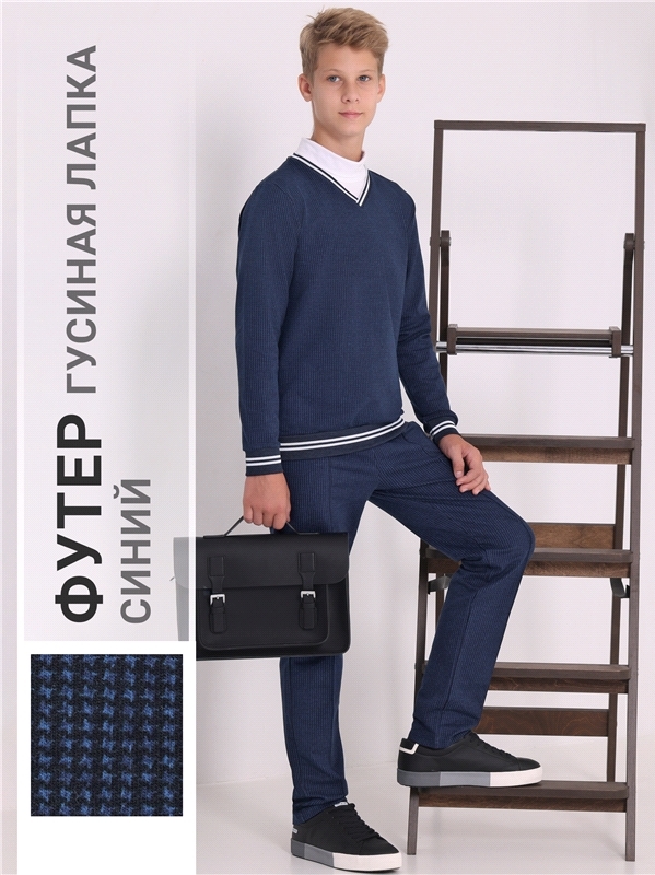 Комплект для мальчика из пуловера и брюк выполнен из футера - плотного хлопкового полотна с лайкрой. Пуловер с длинными рукавами на манжетах и V-образным вырезом горловины. Брюки на эластичном поясе, ... Показать описаниеимеют удобные карманы и декоративные отстрочки-стрелки. Набивка полотна имитирует костюмную ткань - стильный тренд этого года. Отличный вариант для школы! Уход: только машинная стирка (руками не стирать!) при температуре 40 градусов, без предварительного замачивания. Состав: футер / хлопок 95% + лайкра 5%.