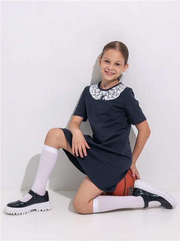 Платье для девочки выполнено из теплого хлопкового полотна с лайкрой. Изделие с короткими рукавами, с застежкой на пуговку по спинке, украшено печатью, имитирующей кружевной воротник. Отличный вариант... Показать описание для школы! Уход: только машинная стирка (руками не стирать!) при температуре 40 градусов, без предварительного замачивания. Изделия с печатью и декором перед стиркой необходимо вывернуть на изнаночную сторону. Состав: футер / хлопок 95% + лайкра 5%.
