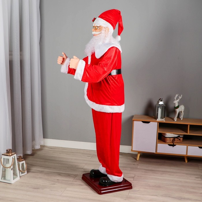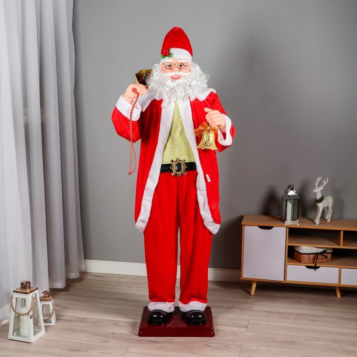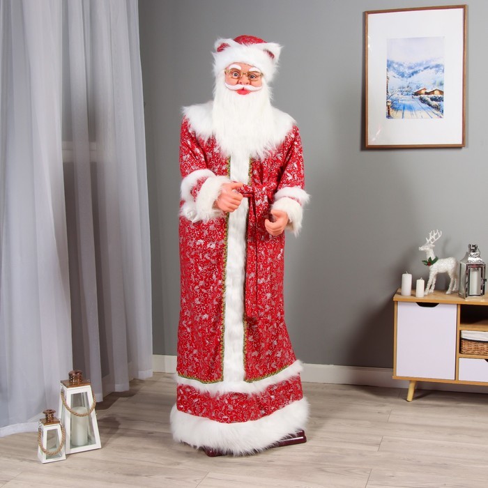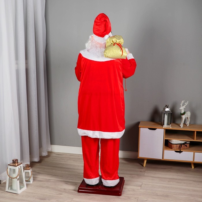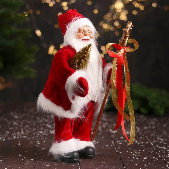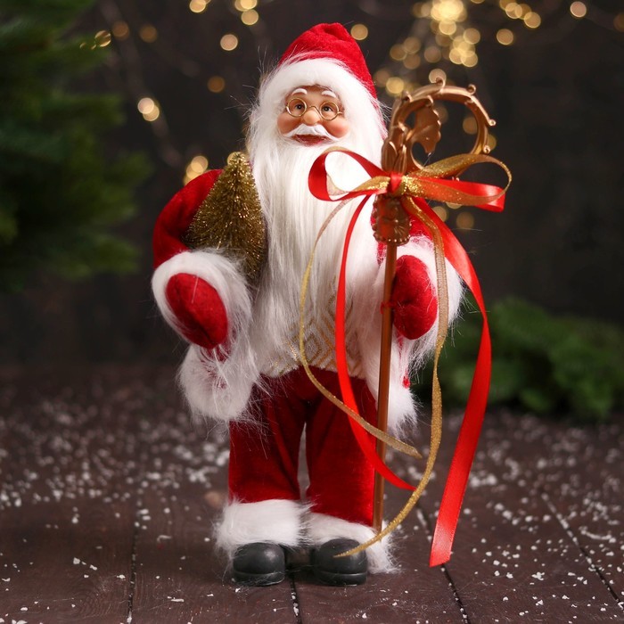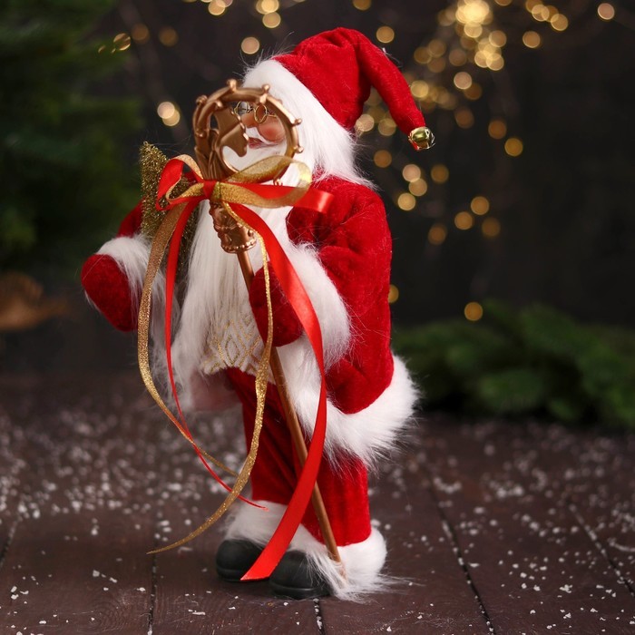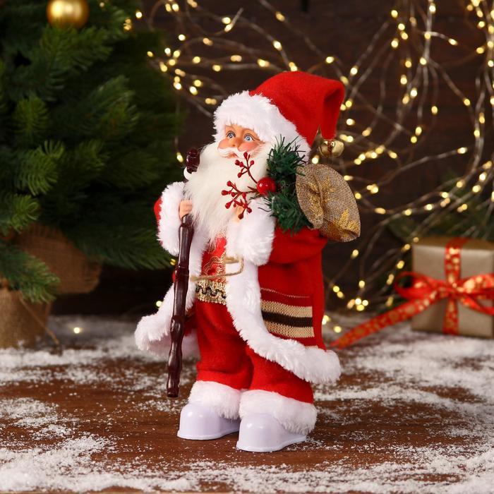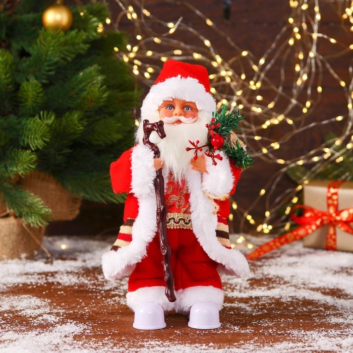 Дед Мороз под ёлку «Зимнее волшебство. В костюмчике с орнаментом, с посохом и подарками» двигается, 30 см Вопросы по товару