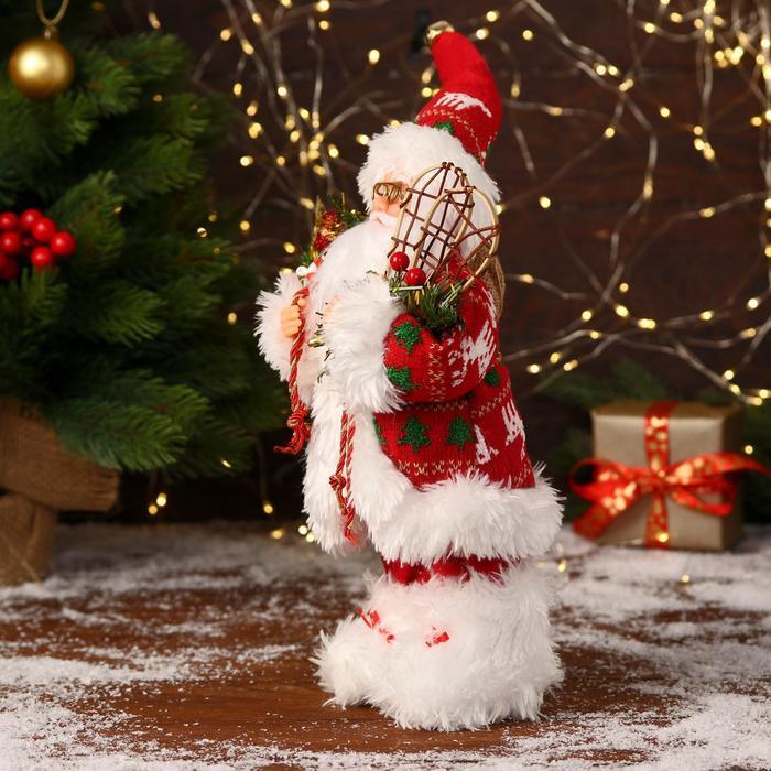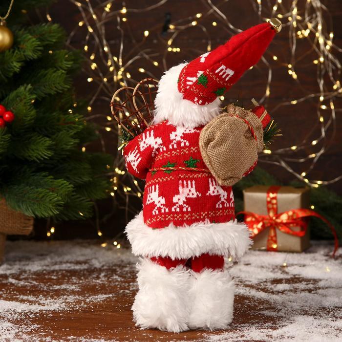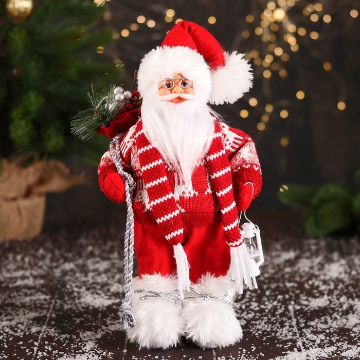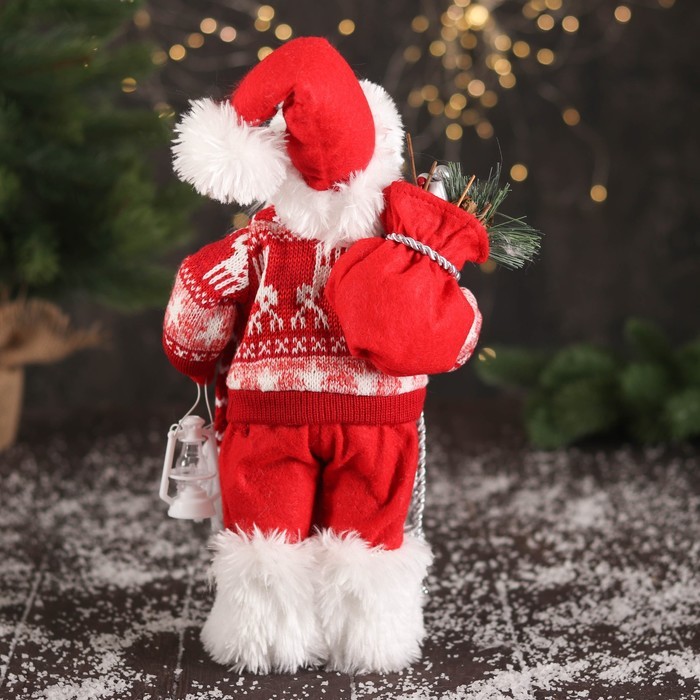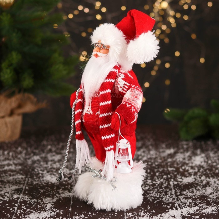 Дед Мороз под ёлку «Зимнее волшебство. В свитере с оленями и с фонариком», 30 см, бело-красный Вопросы по товару