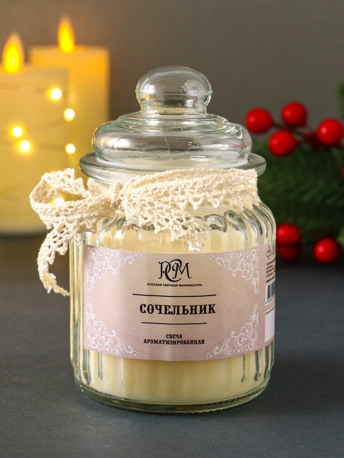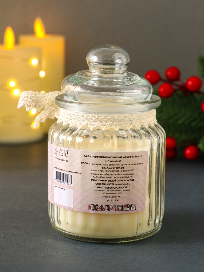 Создайте атмосферу зимнего праздника в вашем доме! Ароматическая свеча «Сочельник» в стеклянной банке — это воплощение предвкушения Рождества и Нового года. Её свежий и чистый аромат наполняет простра... Показать описаниенство ощущением морозной свежести, уюта и спокойствия. * Долгое горение — до 45 часов: Одной свечи хватает на множество вечеров. Вы можете зажигать её снова и снова, не беспокоясь о том, что аромат быстро иссякнет. Это надежный спутник для долгих зимних месяцев. * Стойкий аромат свежести: Холодный и бодрящий букет напоминает о хрустальном инее на окнах, о первом снегопаде и чистоте зимнего утра. Аромат заполняет комнату даже тогда, когда свеча не горит. * Удобная стеклянная банка: Прочная и эстетичная ёмкость не нагревается, что делает использование безопасным. После того как свеча выполнит свою основную задачу, банку можно использовать для хранения мелочей. * Надежный нитяной фитиль: Фитиль обеспечивает ровное и спокойное горение без копоти и треска. Вам не придётся постоянно его подравнивать — просто зажгите и наслаждайтесь. Идеальное дополнение к празднику: Эта свеча станет центральным элементом рождественского декора или приятным подарком для близких. Её лаконичный белый цвет и классическая форма подходят к любому интерьеру. Позвольте аромату «Сочельник» перенести вас в самый волшебный вечер года — канун Рождества.
