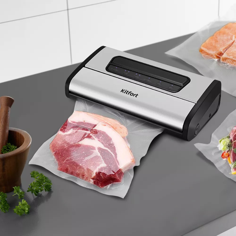 Увеличивает сроки хранения Вакууматор Kitfort КТ-1508 - современный прибор, призванный увеличить сроки хранения пищевых продуктов. Продукты, упакованные под вакуумом, сохраняют свежесть и не портятся ... Показать описаниесущественно дольше по сравнению с обычными условиями хранения. 122 Вакуумируйте сухие и влажные продукты! Также на панели управления есть режим «Сухо/Влажно» для запечатывания сухих или влажных продуктов. Влажные продукты могут намочить край пакета, поэтому время запечатывания увеличено.