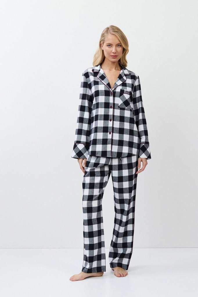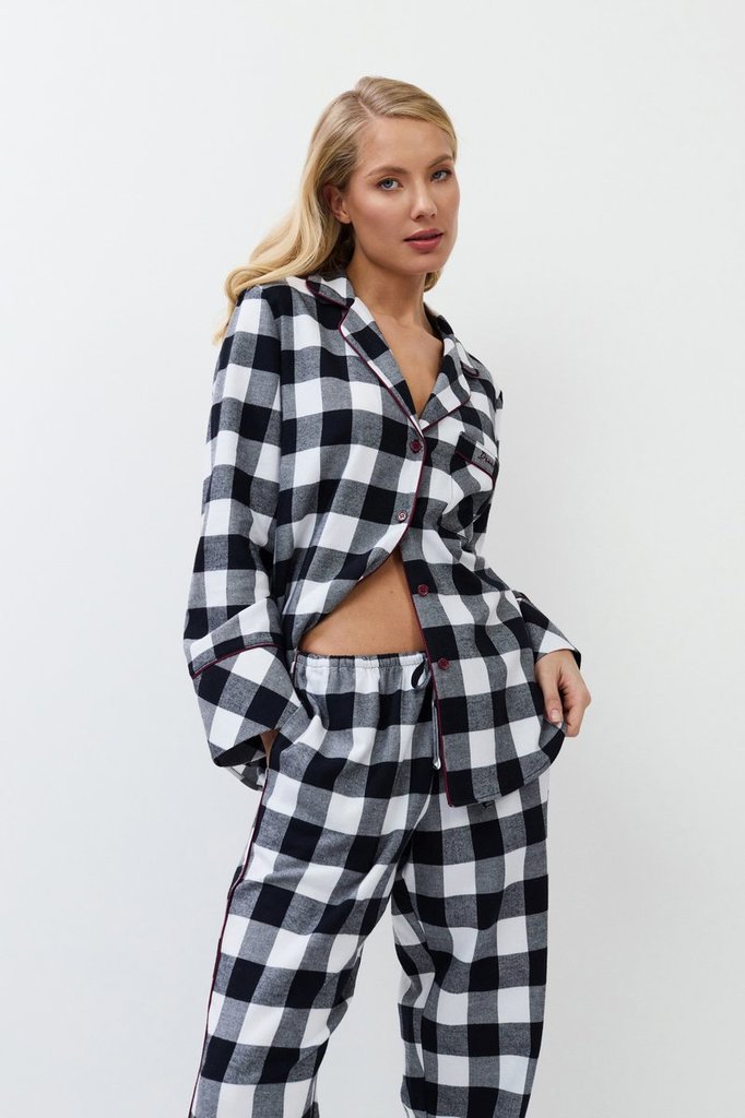 Пижама женская со штанами ANGELICA для вашего ночного комфорта. Пижама выполнена из хлопковой фланели. Рубашка на пуговицах, с длинными рукавами, отложным воротником и нагрудным карманом. Окантовка до... Показать описаниеполняет и украшает комплект. Штаны длинные, свободной формы, с эластичным поясом с завязкой и боковыми карманами. Расслабьтесь с максимальным комфортом и стилем в пижаме ANGELICA.