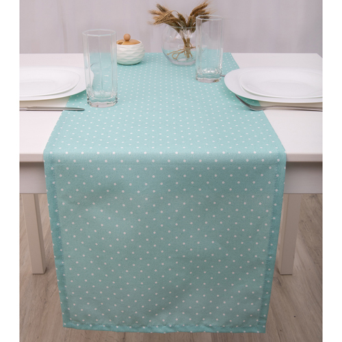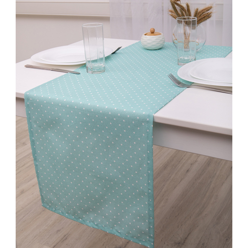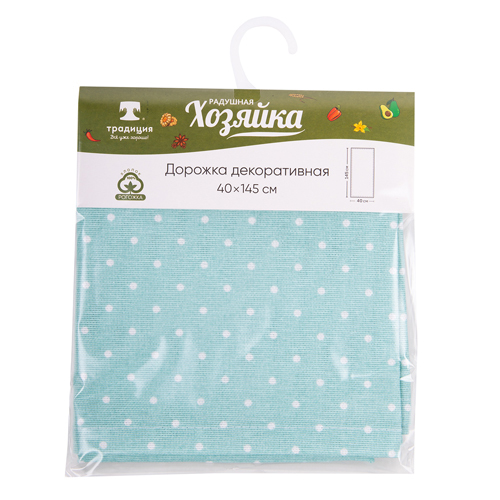 Ткань: Рогожка Состав: 100% хлопок Дизайн: Горошек мята Линейка: Радушная хозяйка (Традиция) Тематика: Абстракция Цветовая гама: Яркие тона Комплектация: Дорожка декоративная - 1 шт. Упаковка: Пакет с... Показать описание крючком, фирменный вкладыш Страна: Россия Дорожка декоративная 40х145 "Радушная хозяйка (Традиция)", выполнена из набивной рогожки (100% хлопок), с современными эксклюзивными дизайнами. Дорожка сделает сервировку стола оригинальной и интересной, а также защитит стол от царапин и различных загрязнений. Благодаря небольшим размерам за дорожкой ухаживать проще, чем за большой скатертью. Можно экспериментировать с сервировкой, дорожку можно стелить вдоль и поперек стола, использовать одну или несколько сразу, комбинировать со скатертью, дополнять другими изделиями из коллекции, например полотенцами.
