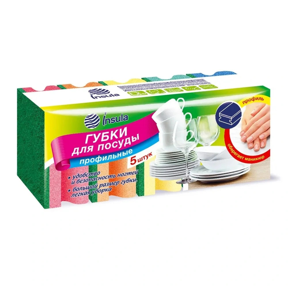 Губки для посуды профильная 5 шт. INSULA подходят для удаления даже самых стойких и въевшихся загрязнений с поверхности различной кухонной утвари: кастрюль, сковород, изготовленных из прочных, надежны... Показать описаниех стали и алюминия высокого качества. Изделия изготовлены из гладкого поролона. Они имеют дополнительный абразивный слой-полосу, который хорошо очищает загрязнения, но не травмирующую при этом поверхность. Подходят для мытья посуды, раковин,плит и других поверхностей.