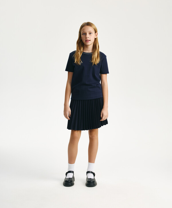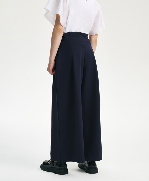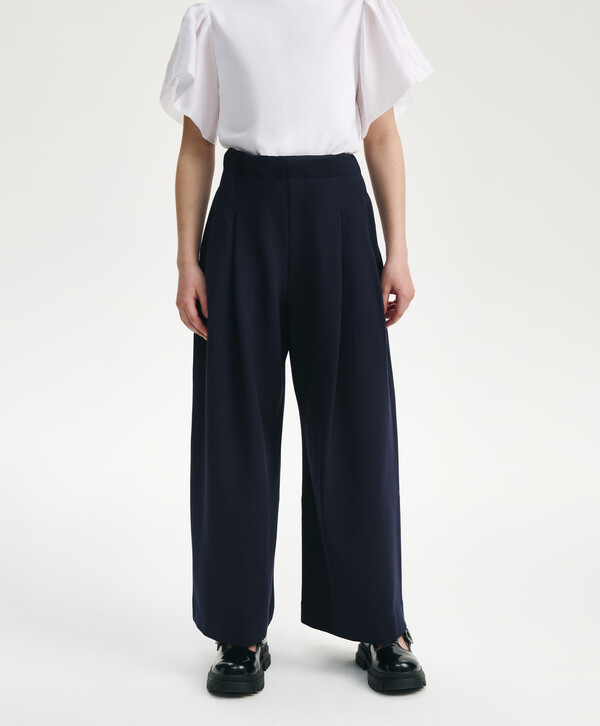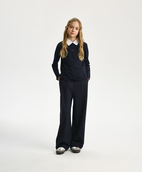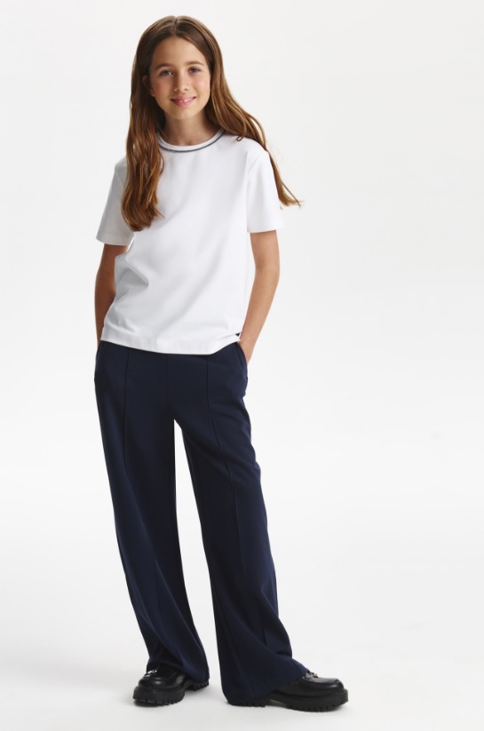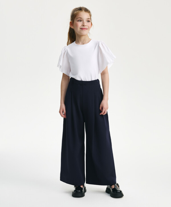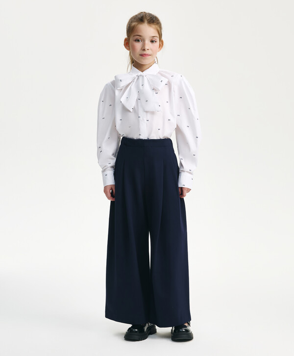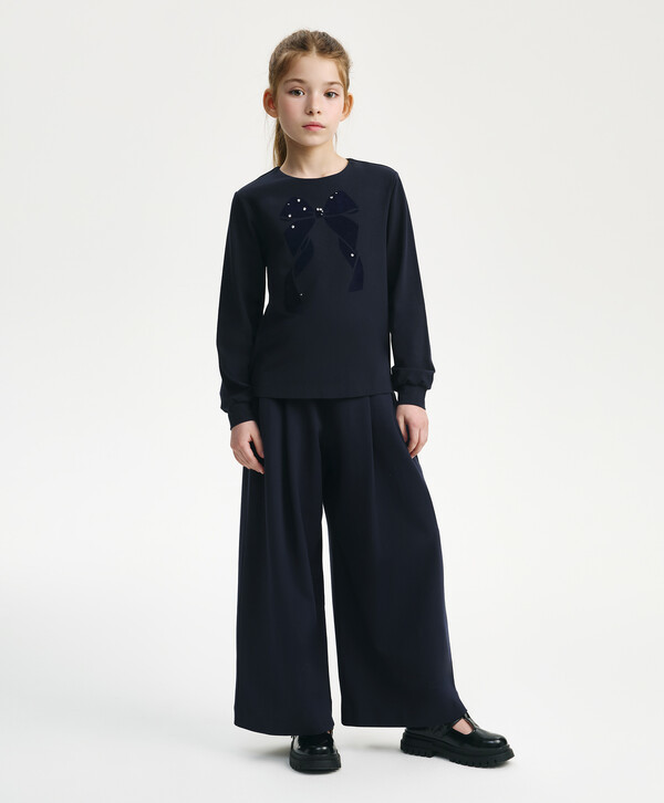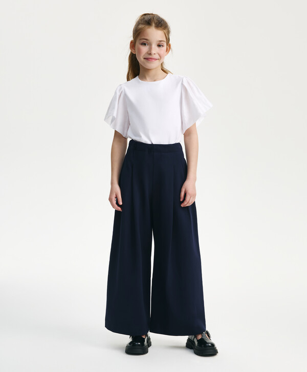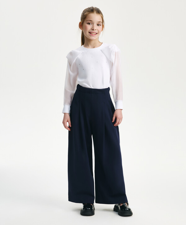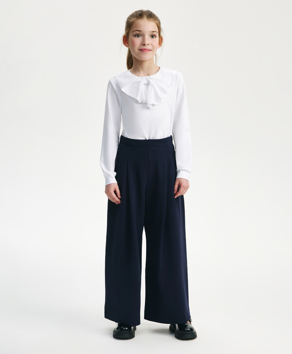 Синие широкие брюки палаццо — стильный элегантный элемент школьного гардероба девочки. Свободная форма, созданная благодаря, в том числе, защипам в области талии, делают брюки воплощением модных тре... Показать описаниендов. Брюки выполнены из мягкого, гладкого, тактильно приятного джерси на основе вискозы, обладающего легкой струящейся пластикой. Они выглядят очень женственно и красиво, наделяя образ девочки особым шармом. Школьные трикотажные брюки имеют цельнокроенный пояс на внутренней эластичной тесьме, способствующей мягкой и комфортной посадке на девочек разного телосложения. Карманы в боковых швах создают удобство в эксплуатации вещи. 68% вискоза,28% нейлон,4% эластан
